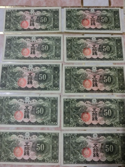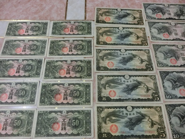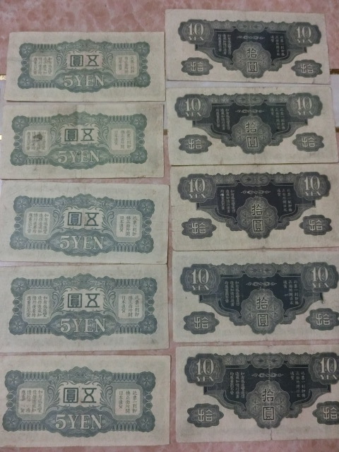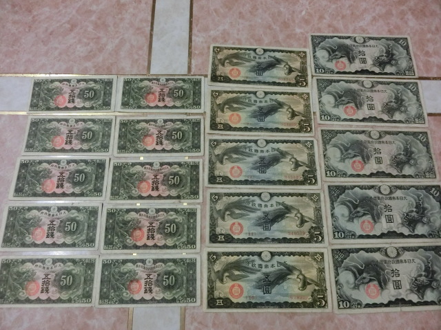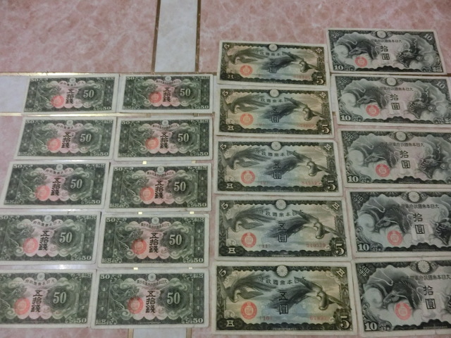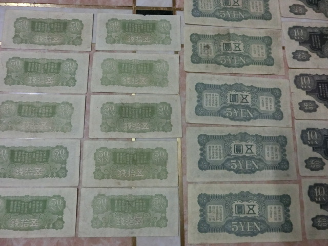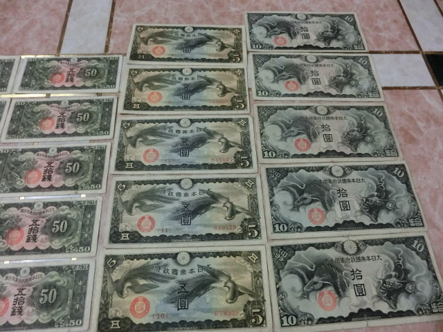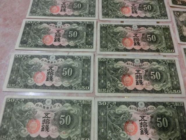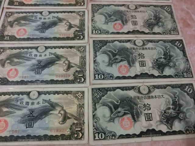 日華事変軍票 丁号50銭・戊号50銭・戊号5円・丁号10円を各5枚ずつ4種20枚セットです。