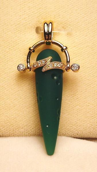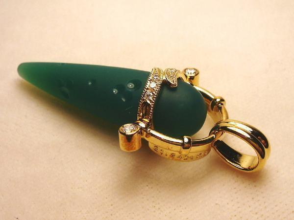 ダイヤのセット、加工仕上げなど最高級仕上げで、見事なグリーンのクリソプレーズは前後にスウィングして魅力たっぷり。