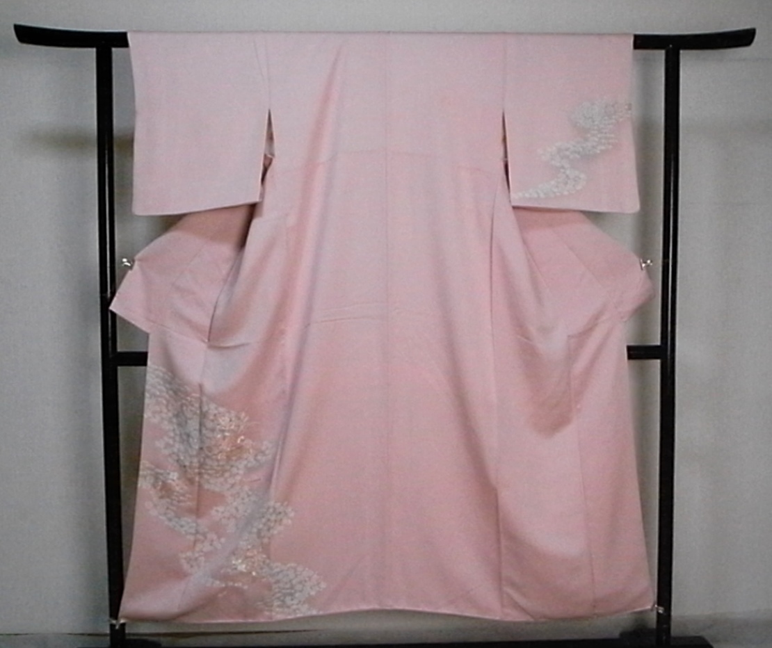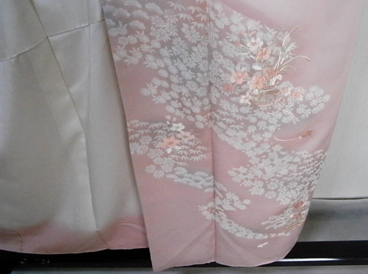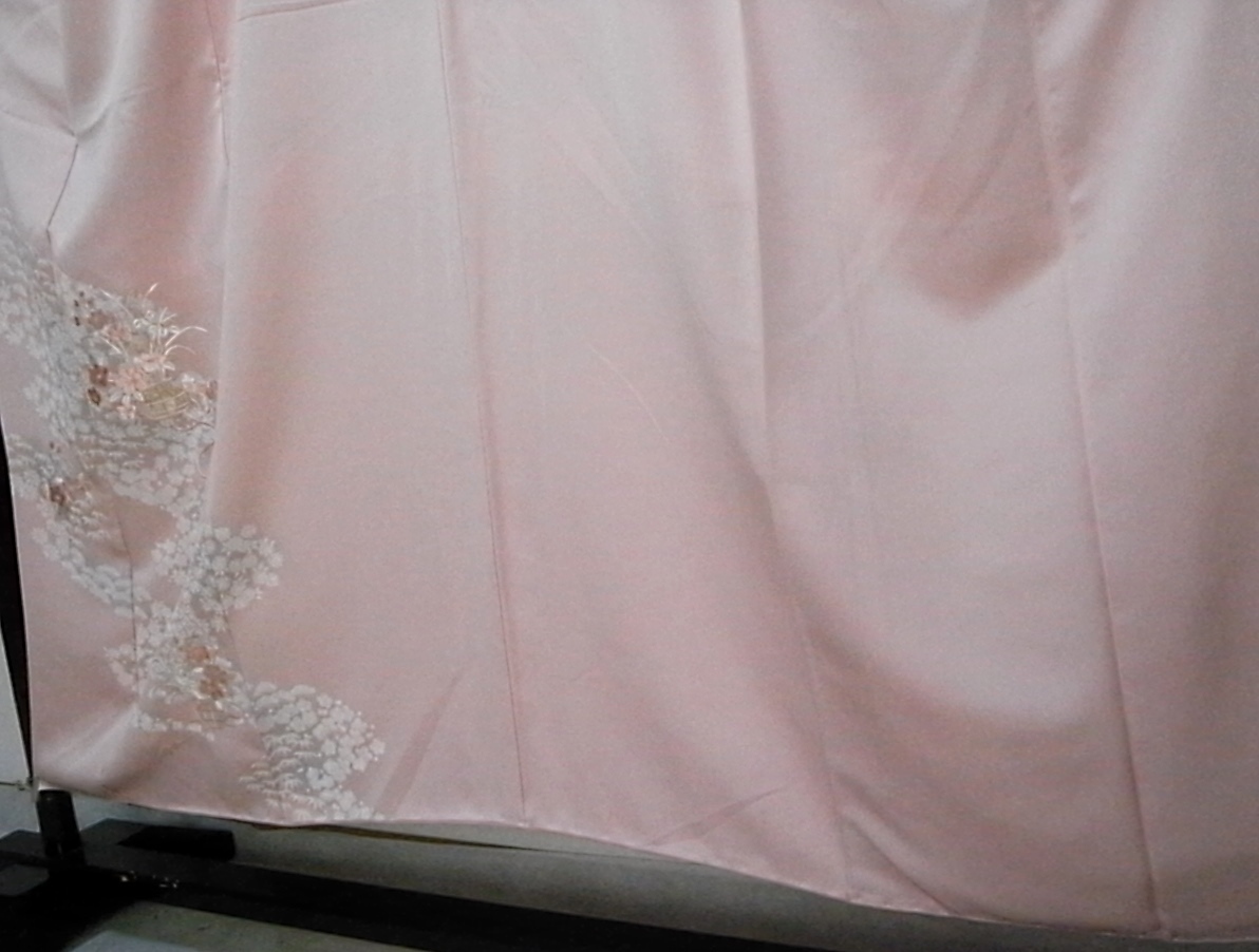 【着物のちさと屋】D120 着物・付下げ 袷 良質 美品 正絹羽二重風ちりめん 薄桃色地・花葉小柄 + 刺繍花柄模様