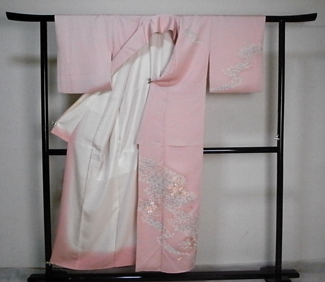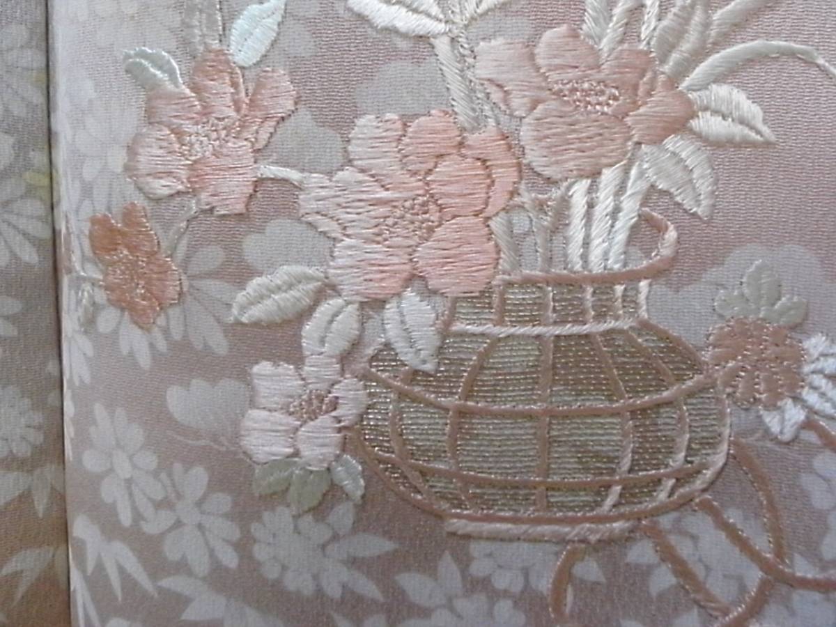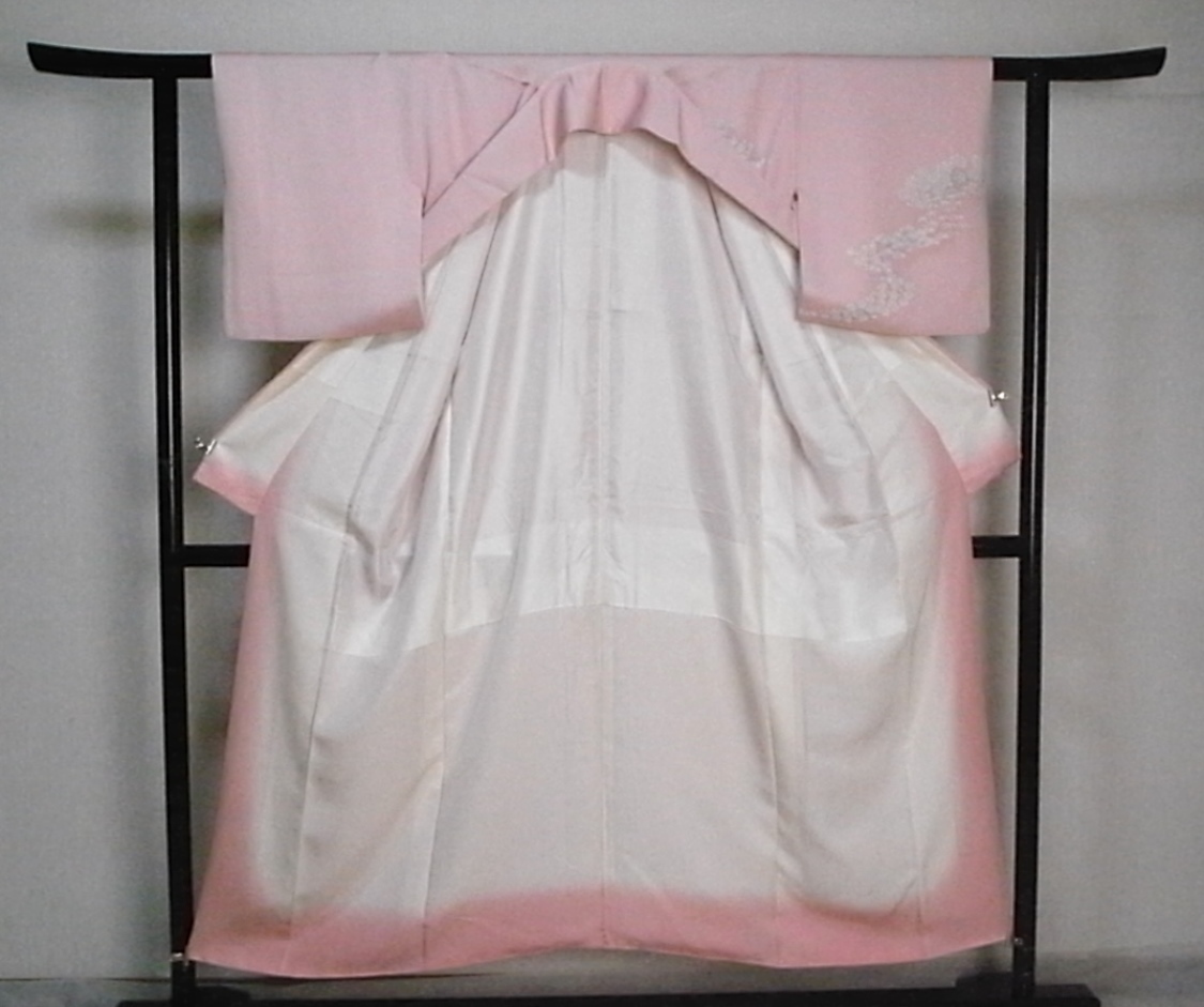【着物のちさと屋】D120 着物・付下げ 袷 良質 美品 正絹羽二重風ちりめん 薄桃色地・花葉小柄 + 刺繍花柄模様