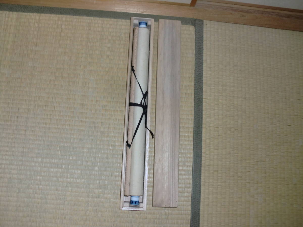 絹本、表装 絹、軸先  陶器(綺麗なブルー)。