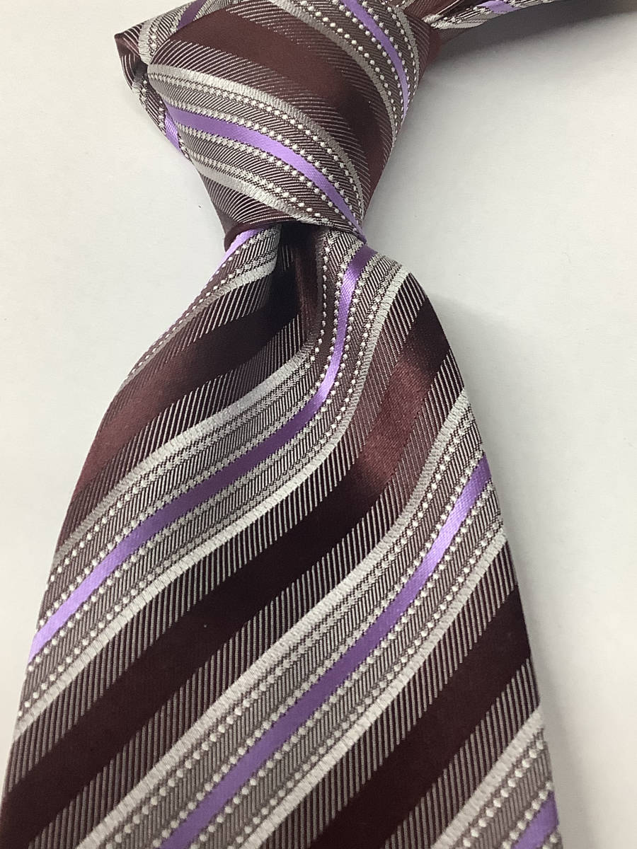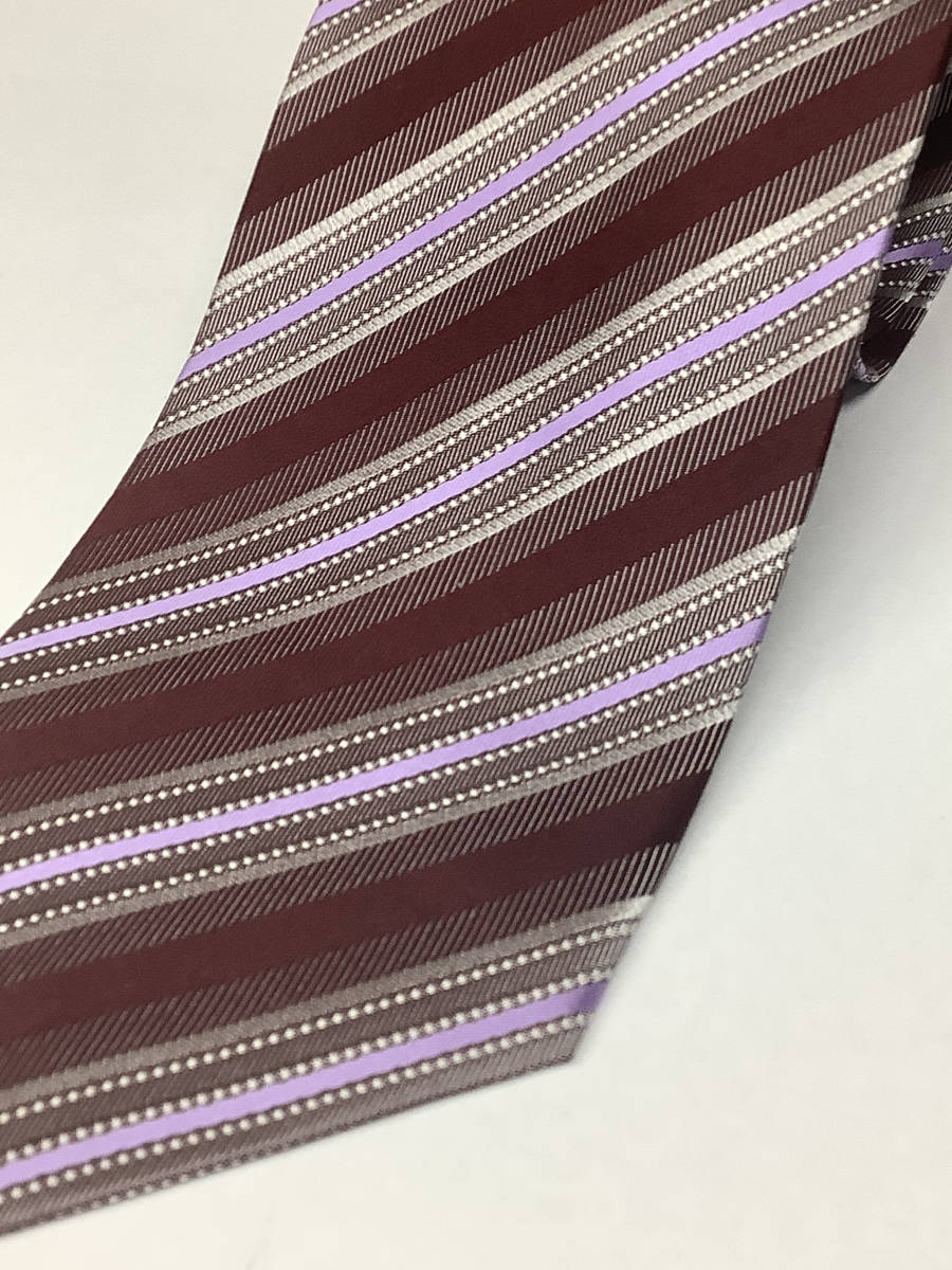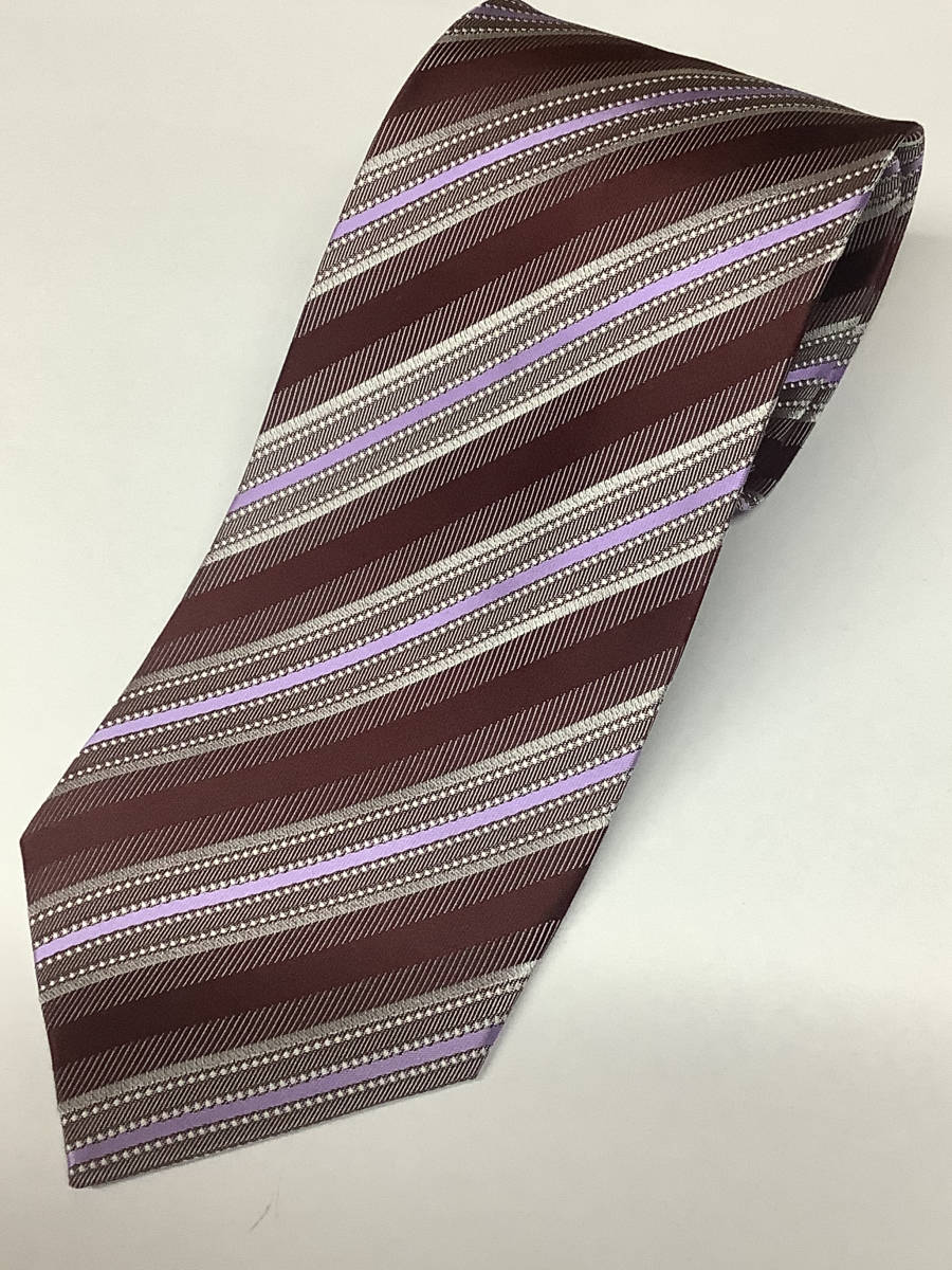 新品タグ付き 定価6,800 京都織物使用のノーブランドネクタイ 極上のパープルとエンジの柄ストライプ