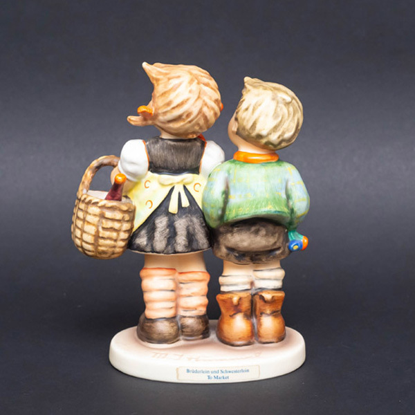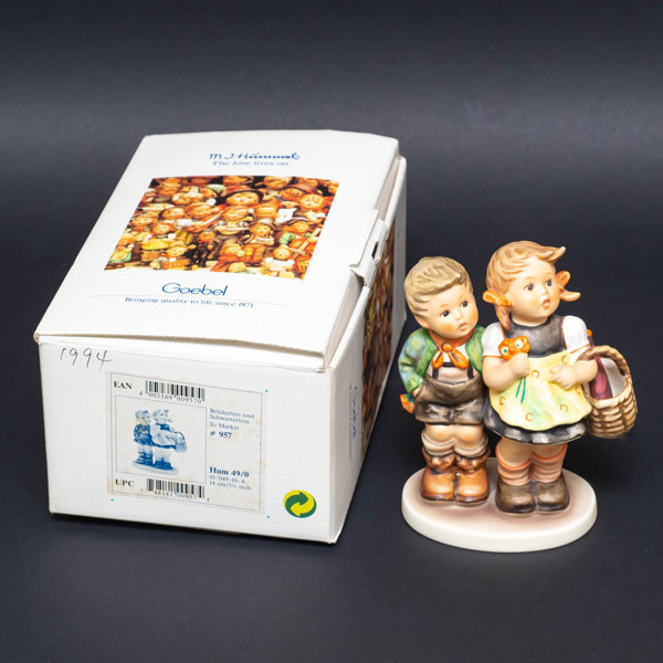 『To Market(市場に)』と題されたゲーベルのフンメル人形(陶器人形)。 原題は"弟と妹"。小さな弟妹2人で市場におつかいにいくところでしょうか。よほど気になるものがあったのか仲良くそちらを見つめています。無事おつかいできたのか気になります。フンメル人形はぬくもりを感じる独特のデザインで世界的に人気がありますが、現在は廃盤になっています。(Hum-49/0) ■サイズ 幅102 × 奥行48 × 高さ136mm ■付属品 箱(数字の記入あり) ■状態 B(良品):特に目立つダメージのない、状態の良いお品物です。 |