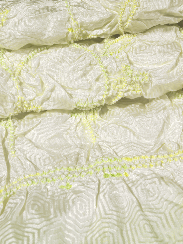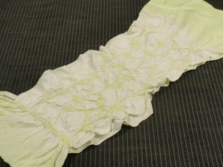 ぼかしの濃淡のある淡い若菜色の地に入れ子亀甲の地紋が織り出され、絞りで唐草花の文様が施されている、綸子の帯揚げです。中抜きです。 ところどころに淡い淡黄(たんこう)色の挿し色が配されています。さわやかかさが感じられるお色です。 ユーズド品で、片端から約 42cmの中央に直径約 3cm のうっすらとした黄変が 1 か所、もう一方の片端から約 59cm の中抜き部分に直径約 2-3mm のごくうっすらとした黄変が 1 か所あります。色柄に紛れてあまり判別はつかず、そのほかに目につく大きなしみやよごれ、褪色などのダメージはないので、気にされない方であればご着用は可能と思われますが、状態ランク=「D」のご着用対象外、リメイク素材用とさせていただきます。 |