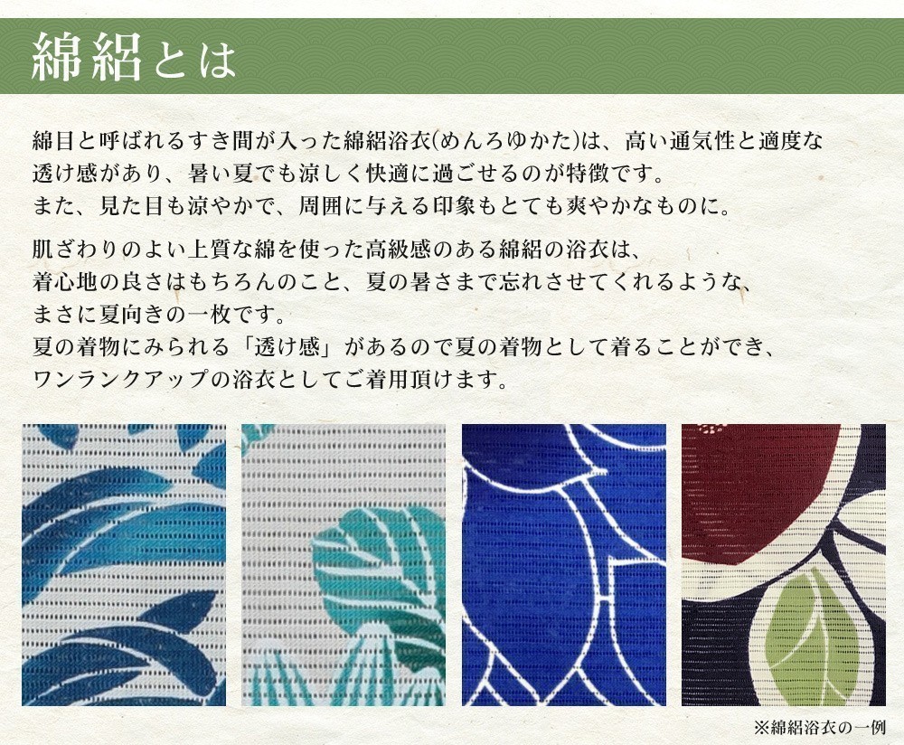 シワがよりにくい生地のため、綺麗に畳んだら、洗濯ネットに入れてご自宅の洗濯機で洗うこともできる、美しさと使いやすさを兼ねた浴衣生地。風通しがよく、とても涼しく感じる夏素材です。