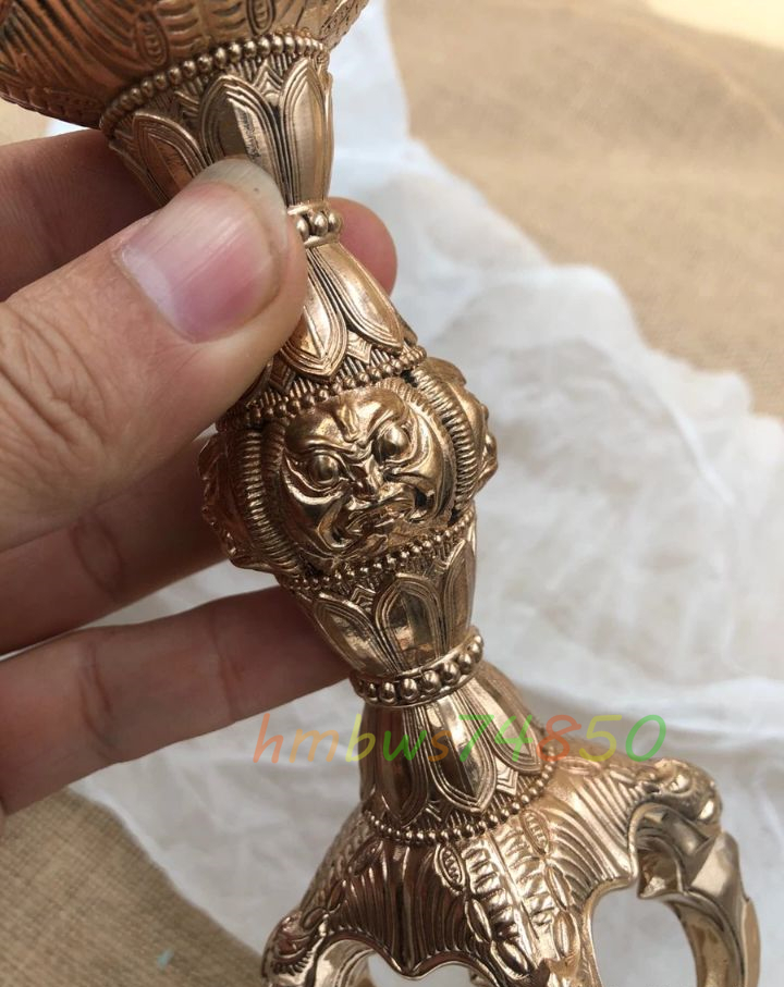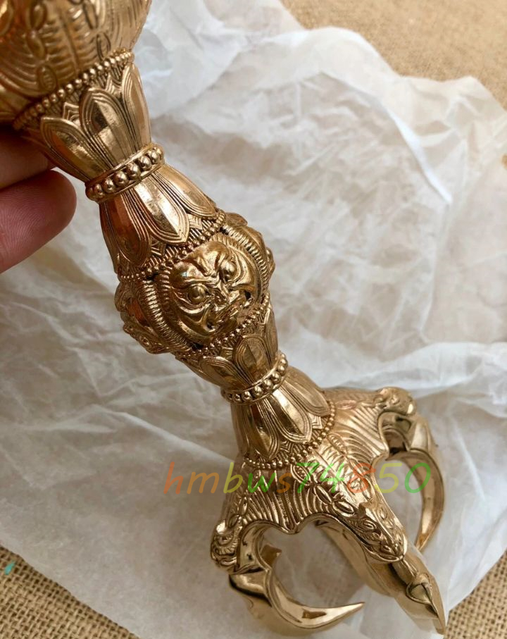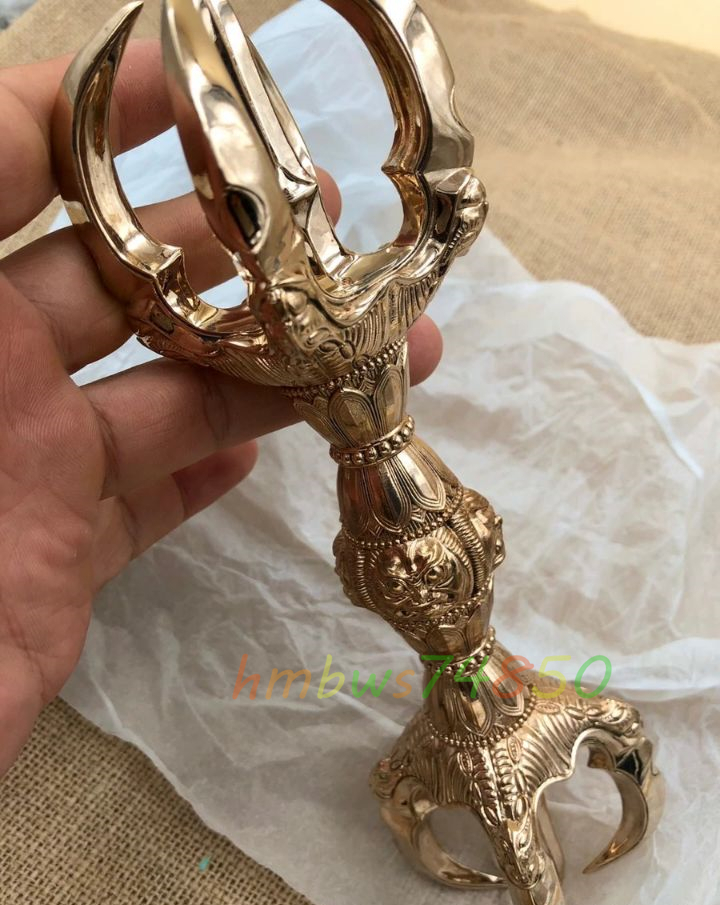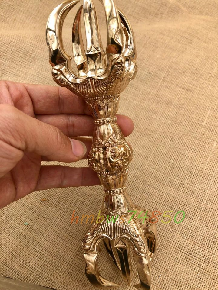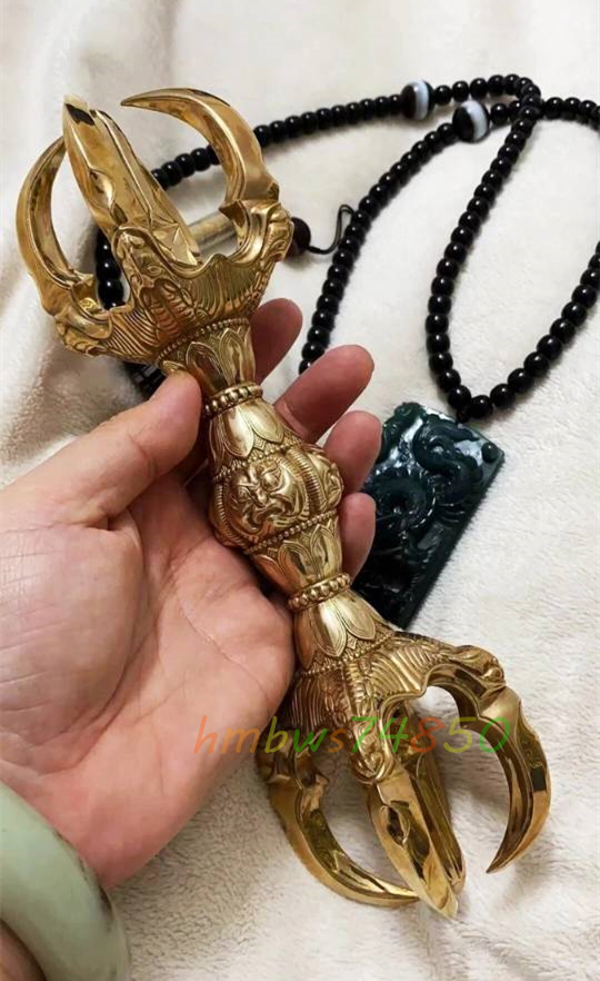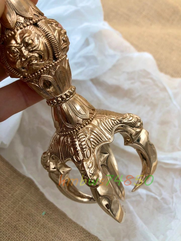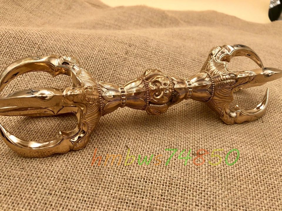 金剛杵には3つの形があり、両端がひとつの突起になったものを独鈷杵(とっこしょ)、三股のものを三鈷杵(さんこしょ)、五股のものを五鈷杵(ごこしょ)といいます。 独鈷杵は金剛杵の基本形で、五鈷杵は最も重要視される法具です。 弘法大師が唐から持ち帰り生涯大切にし、祈祷のとき必ず手にしていたのが五鈷杵です。 どの金剛杵も、魔をうち砕く力を秘め、困難や煩悩を振り払う法具として用いられ、身近にあるだけで、厄除け・災難除けになるといわれます。 お守りとして携帯されても、ご自宅や会社の机の上に置いておかれても結構です。 商品状態:未使用 五鈷杵:長さ23cm 材質:銅 | |||