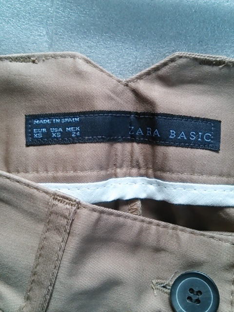 やや光沢のあるブラウンベージュ無地、やや薄手のはりのある生地感、チノパンスタイル、バックポケットはフェイク、スペイン製。