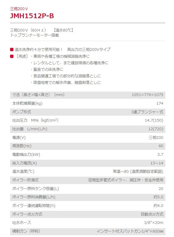 【商品詳細】 【新ダイワ JMH1512P-B 温水高圧洗浄機】 三相200V(60Hz) 【温水80℃】 トップランナーモーター搭載 温水洗浄約4分で使用可能! 高出力の三相200Vタイプ [用途]・車両や各種工場の機械油脂洗浄に ・レンタルとして、また建設現場の各種洗浄に ・畜舎での床洗浄に ・食品関連工場での部分的な油脂落としに ・降雪地帯での解氷作業、融雪剤落としに 寸法(長さ×幅×高さ)(mm):1051×774×1075 本体乾燥質量(kg):174 ポンプ形式:3連プランジャー式 吐出圧力 MPa(kgf/cm2):14.7(150) 吐出量 L/min(L/h):12(720) 電源(V):三相200 周波数(Hz):60 電動機出力(kW):3.7 総入力電流(A):13~14 温水温度(℃):常温~80 (温度調節設定範囲) ボイラー貯湯式:密閉型多管式ボイラー、減圧弁・安全弁使用 ボイラー燃料タンク容量(L):20 ボイラー燃料消費量(L/h):約5.0 ボイラー連続運転時間(h):約4.0 ボイラー点火方式:自動点火方式 吐水ホース:3/8"×20m 噴射ガン(呼称):インサート付スパットガン1/4″×600mm ■写真は、イメージです。 メーカーホームページはこちらから株式会社やまびこ 重量物は法人様のみ車上渡し元払いになります。 個人様は、運送会社様の営業所止めになります。 ※仕様は予告なく変更になることがございます。 ※下記注意事項の確認をお願いいたします。
