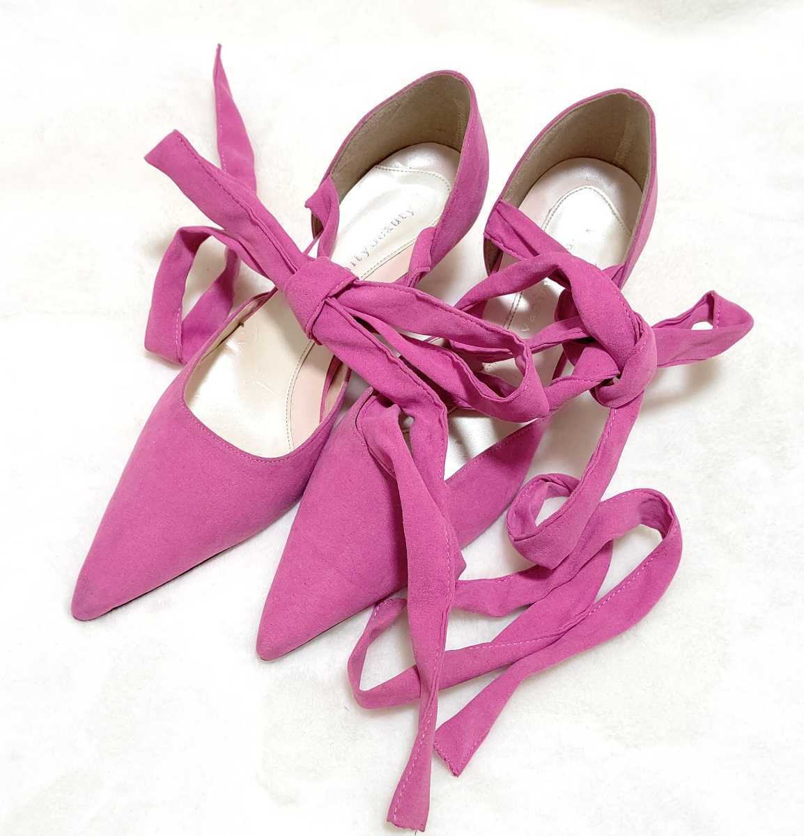 柔らかい素材のリボンを足首に巻き上げて着用するタイプ。華やかなピンクカラーでコーデのポイントになります。