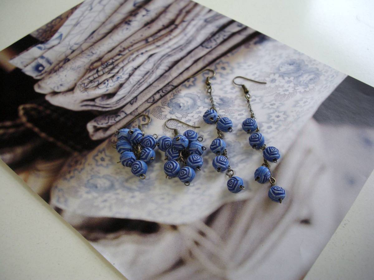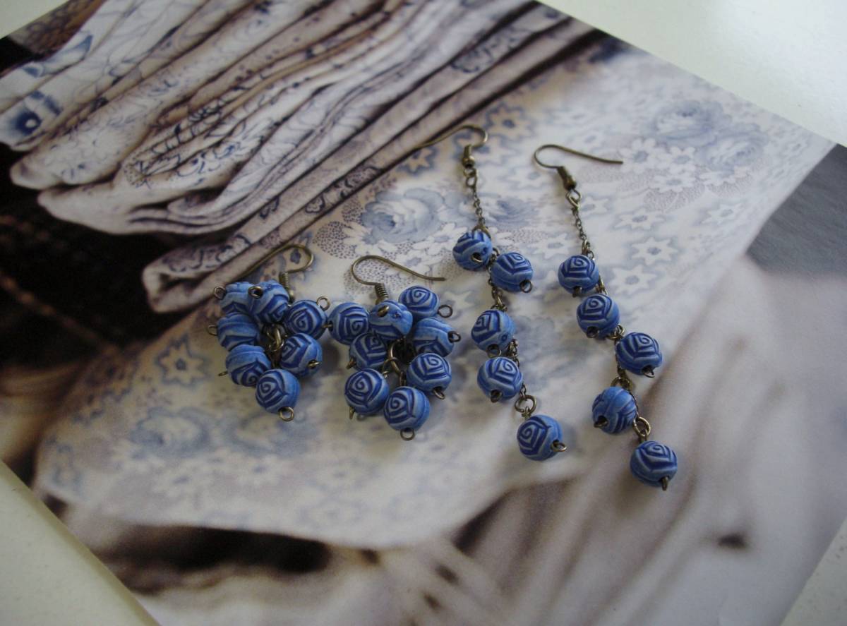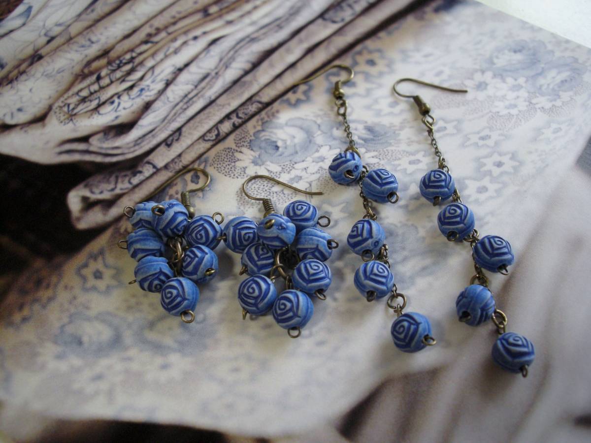 大人色・コレクション・・シリーズです♪蒼い薔薇に抱かれて・・シックな蒼い樹脂薔薇のピアス2点セットです♪デザイン違いのペア2組です♪ダークブルーの小さな薔薇を繋いで可憐な表情です♪樹脂薔薇が軽い着け心地です♪長さは右側の長い方が全長9センチ、左側が全長4センチ位です♪イヤリングに変更出来ます♪お揃いのシリーズも 出品しています♪シンプルでいつまでも着けられる デザインを考えて作り ました!ハンドメイドをご理解 頂いてノークレーム、ノーリターンでお願いします