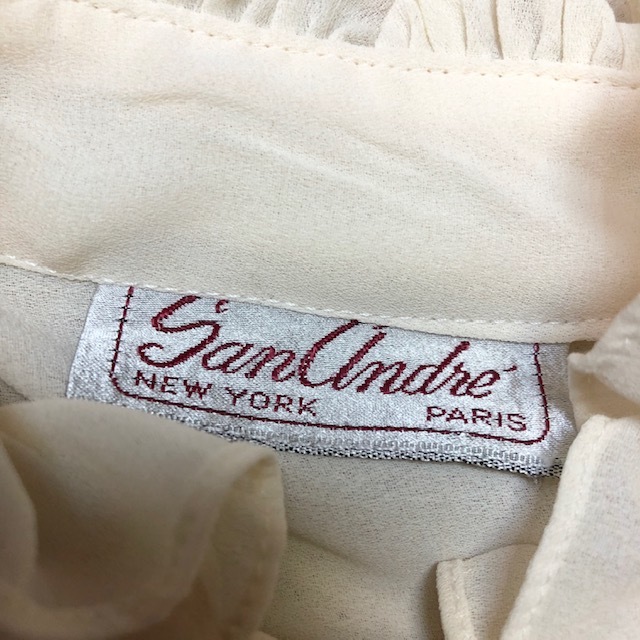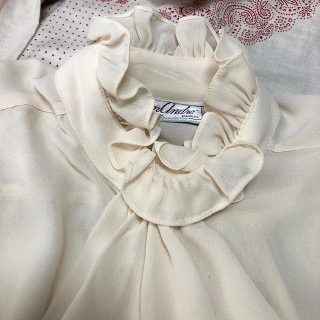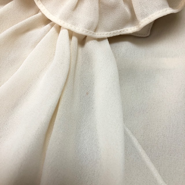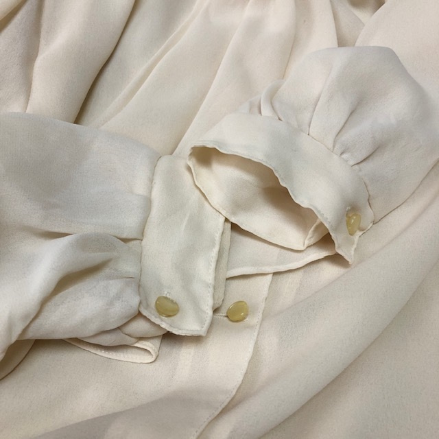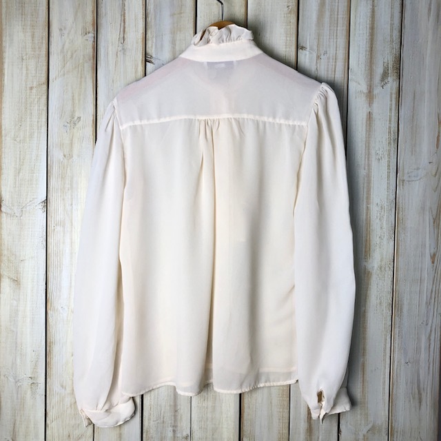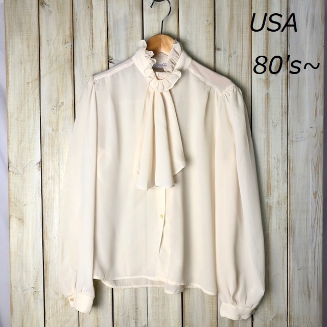 ●商品説明・・・アメリカ買い付け品になります。80年代頃~と思われるオールド・ヴィンテージのやや透け感のあるシフォン生地のフリル襟ブラウスです。襟元にもリボンというかスカーフのような飾り付きになっています。アームホールも太めで、部分的にギャザーも入ったレディースらしいふっくらしたシルエット感です。素材はポリエステルで、色は生成りというか薄いアイボリーベージュのような感じです。サイズ表記はありませんが、M~L程度のサイズ感かと思います。