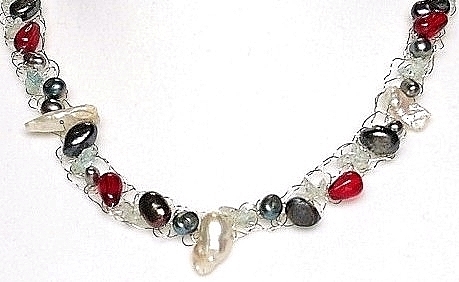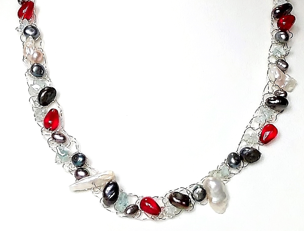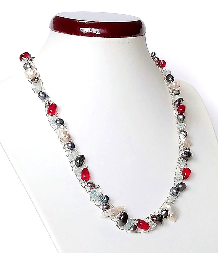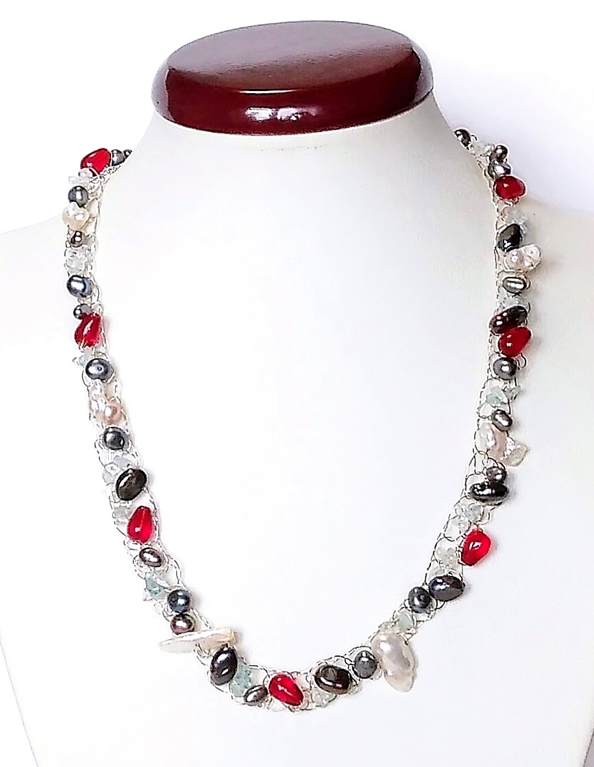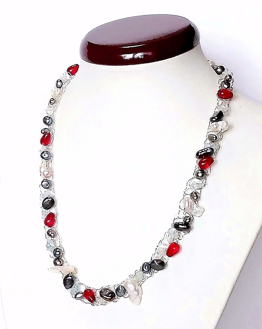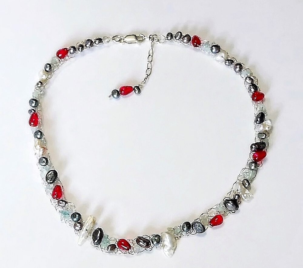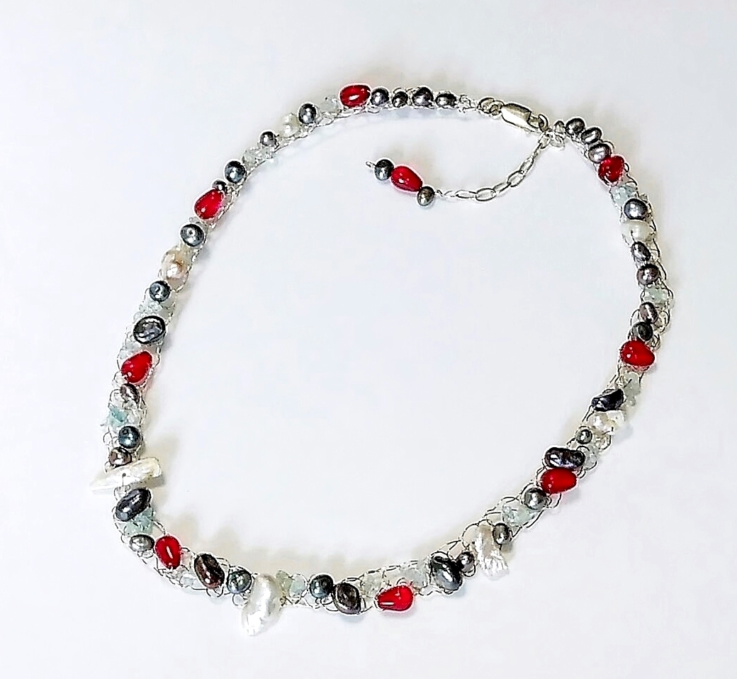 ハンドメイドの1点物です。 純銀の極細ワイヤーに天然石(パワーストーン)を編み込んだ、繊細でグレード感のある 上品な大人のアクセサリー。 さわやかな淡いカラーの中に、赤いインドビーズが効き色として映えてとてもきれいです。 又、貝パールの変形の形がアクセントになって面白さを出しています。 身につけていることを忘れる位ソフトで軽く、つけ心地抜群。 普段使いにもどうぞ。 市場ではあまり見かけることがない希少価値のあるアクセサリーです。 いつまでも輝きを保つ、純銀アクセサリーのお手入れ法を同封いたします。 問屋を通さず、メーカー直結ならではのプライスでご提供いたします。 絶好のチャンスをお見逃しなく!! 素 材:ワイヤー部分・超ソフトタイプの純銀(純度99.9%) 留め金具・シルバー925 グレー系淡水パール(淡水真珠)・貝パール・アクアマリン・インドビーズ サイズ:本体の長さ・38㎝ アジャスター・5㎝ stn-015 市場価格の5割引でご奉仕いたします。 | |||