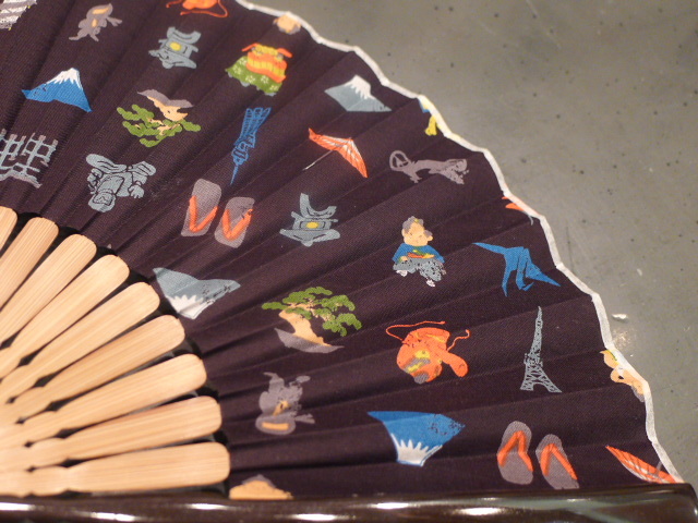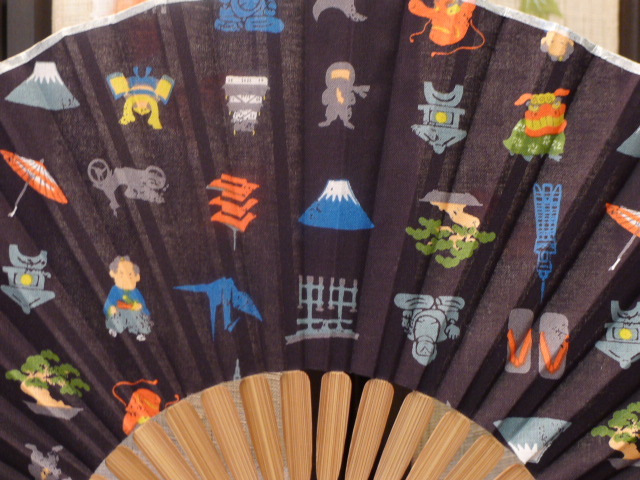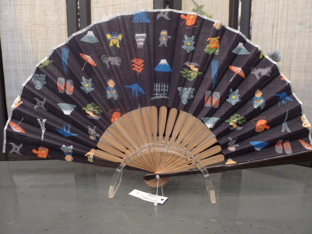 ★即決★日本 扇子 豆景色 黒地★侍・忍者・天狗・兜・富士山・城・折鶴・盆栽・大仏・下駄・手裏剣★