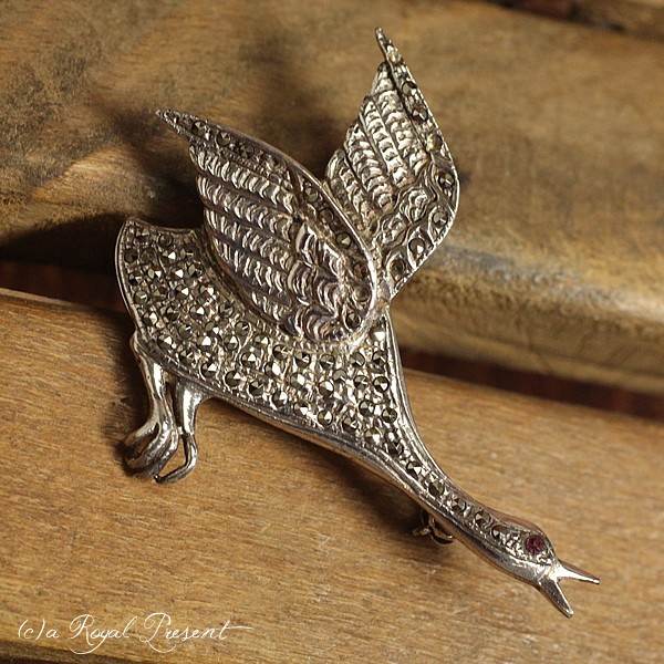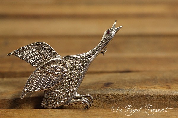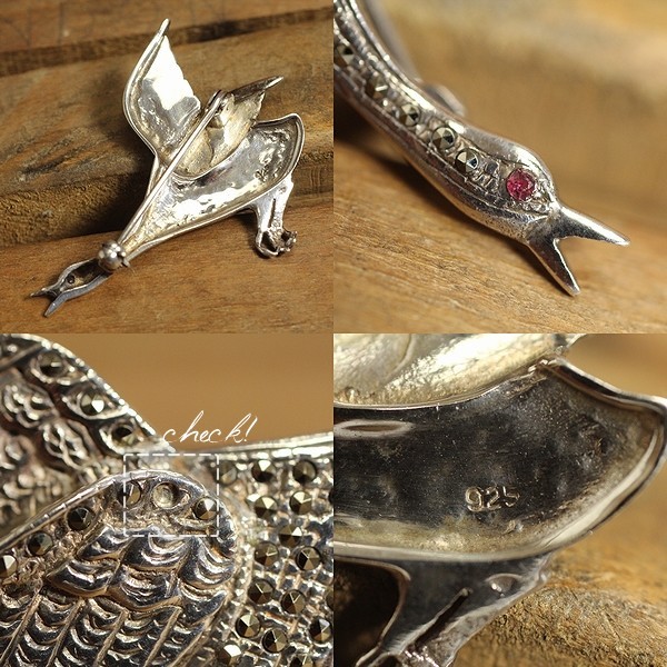 アール・デコ時代(1920年から30年代)の | 鳥のブローチです。 made inUSAです。 素材は925スターリングシルバー、ルビー、マーカサイト石です。 サイズは4.3×3.7cmです。 重さは5.4gです。 写真の通り、おおむねいい状態です。 生き生きとしたデザインの鳥のブローチです。 全体に埋め込まれたマーカサイト石の輝きがたいへん豪華な印象です。 目の部分にはルビーが入っています。 ※1箇所石が欠損しているところがございます。画像にてご確認くださいませ。 アンティークの商品ですので 経年による小さな凹みや細かい傷などは どうぞ味わいや魅力としてご理解くださいませ。 R-4095 |