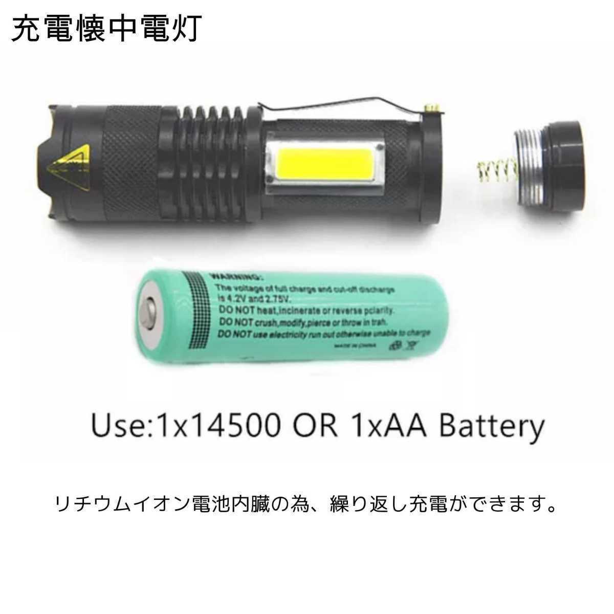 小型USB充電懐中電灯、内蔵リチウムイオン充電電池型強光懐中電灯、直接USB充電可。
