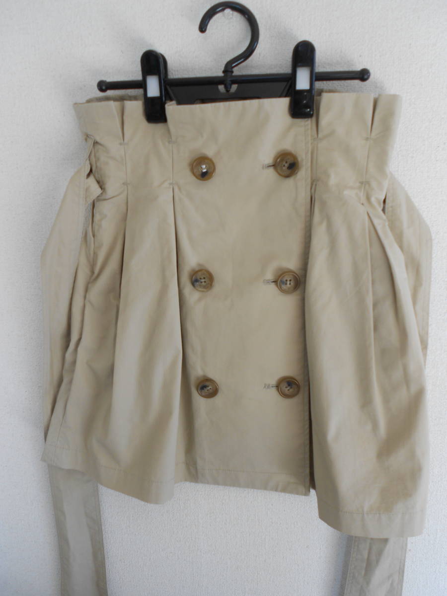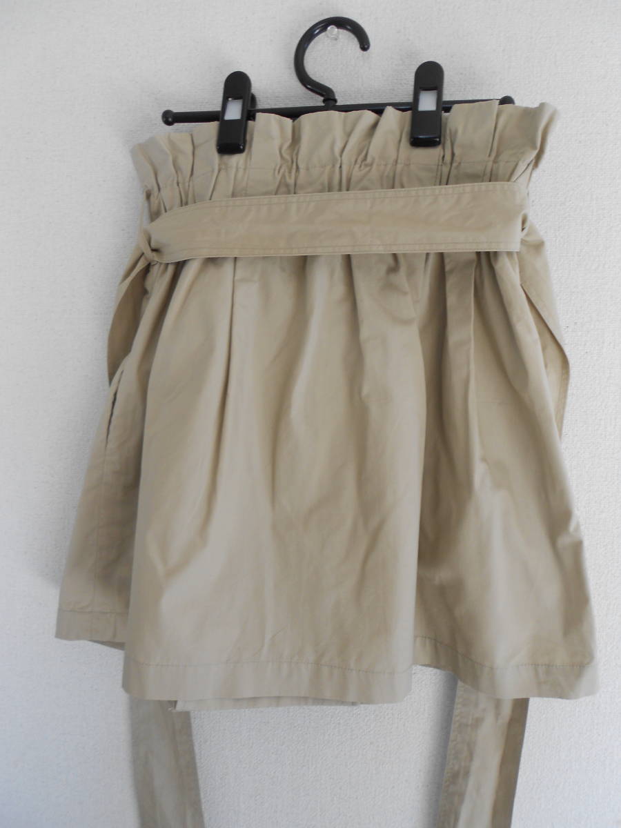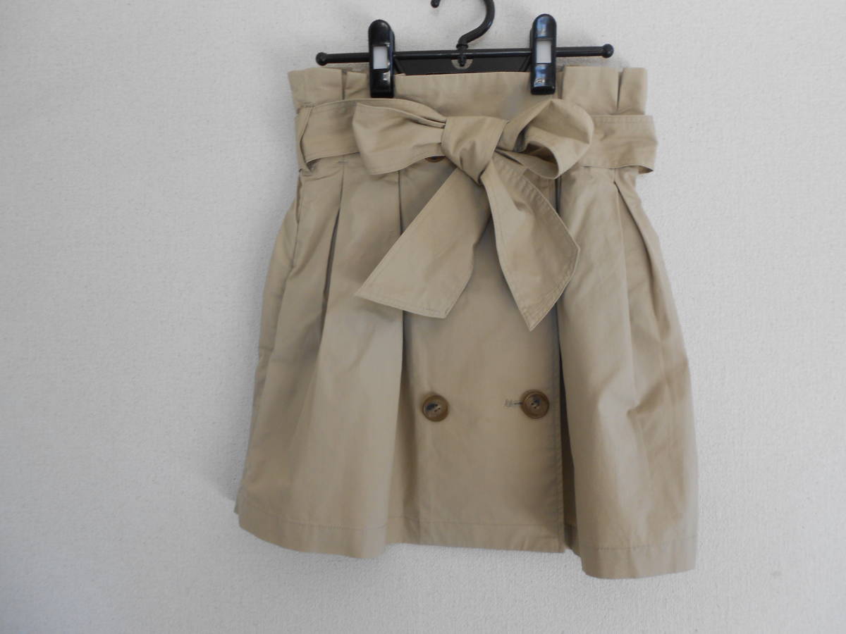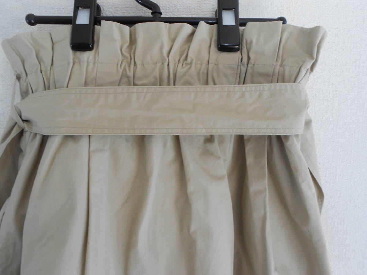 Heather;ベージュ色、大きなボタン6個、ウエストリボン結びおしゃれなタックスカートです。ほとんど使用していないので未使用に近い状態です。素材は綿100%です。スカート総丈45,ウエスト幅43,Fサイズです。購入時点からb1個ボタンが取れそうでしたので付け直しています。送料はクリックポスト185円です。