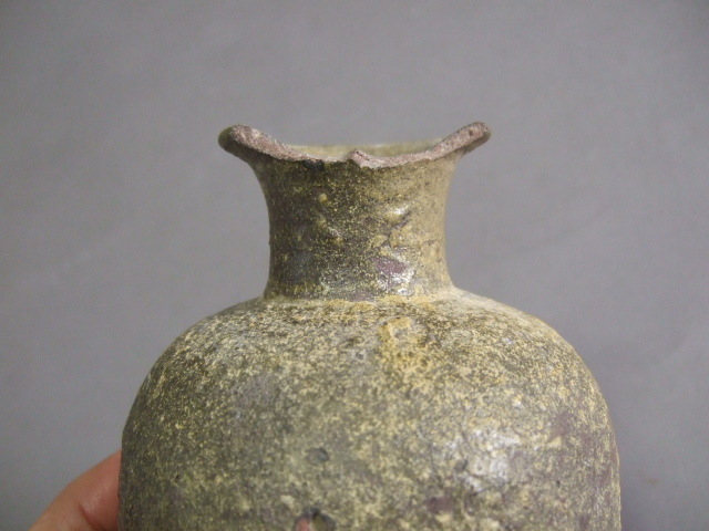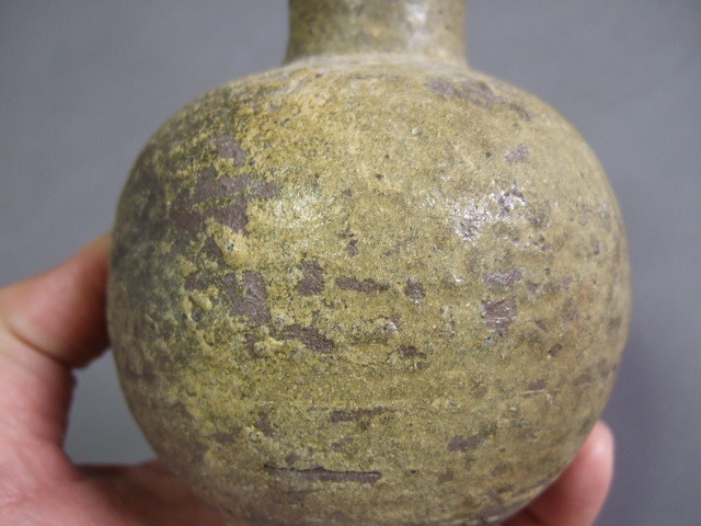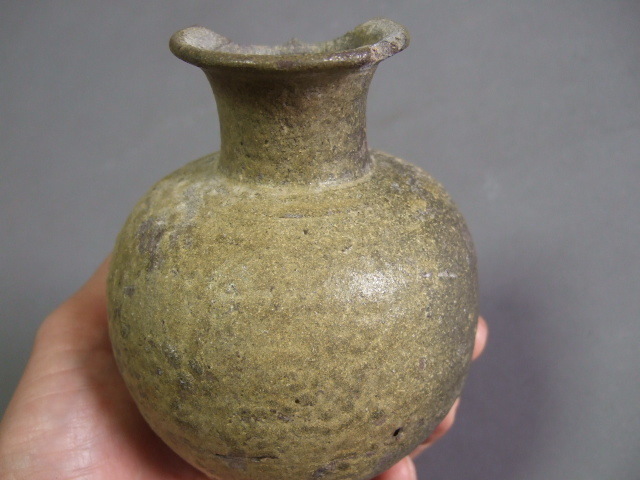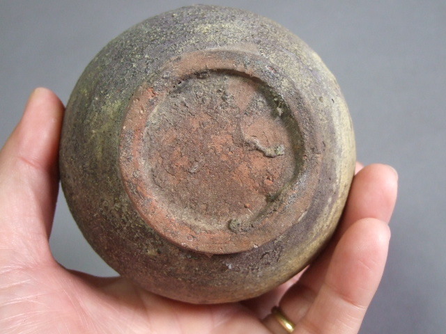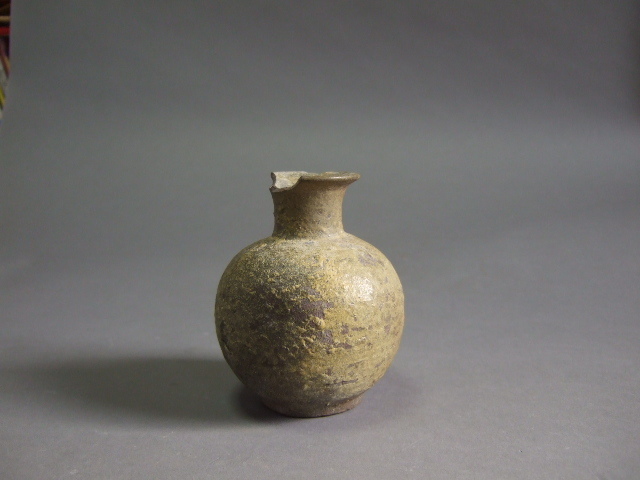 高さ11.5cm、胴径9cm。重さ429g。容量約280cc。堂々たる姿形、焼き締まった八重山独特の重い赤土、分厚く降り積もった黄色のゴマ釉、酒器にもってこいの手取りと容量、口縁に欠けはあるもののオリジナルを半分以上遺した口、水漏れ・匂いなしの素晴らしい八重山古陶の逸品です!それにしてもこの時代に琉球でもパナリと呼ばれた八重山諸島で焼かれたやきものに、まるで隔世遺伝したかのような須恵器や猿投の優品のような堂々たるかたちがいかにして備わったのでしょうか。近年発見された八重山古陶の謎は未だ深まるばかりです。これまで手にしてきた八重山古陶の中でも最上の逸品です。