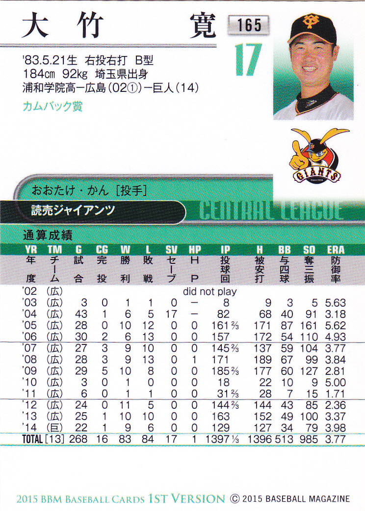 BBM2015ベースボールカード1st 165 大竹寛 埼玉県 浦和学院高校 ドラフト1位 広島 巨人 読売ジャイアンツ