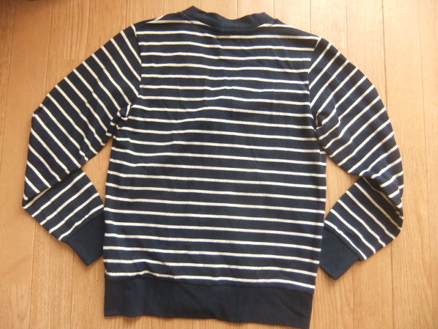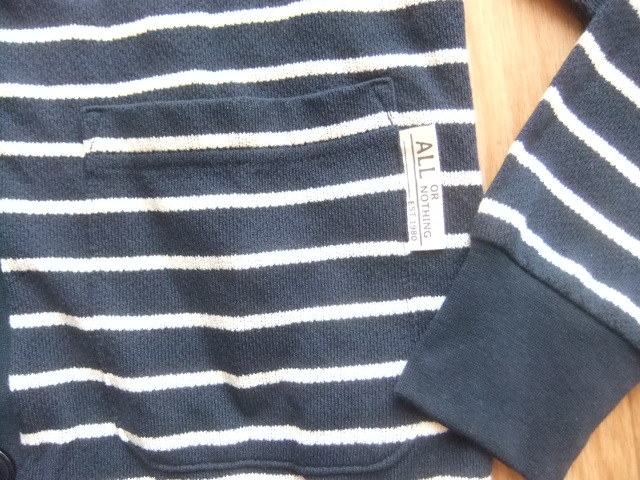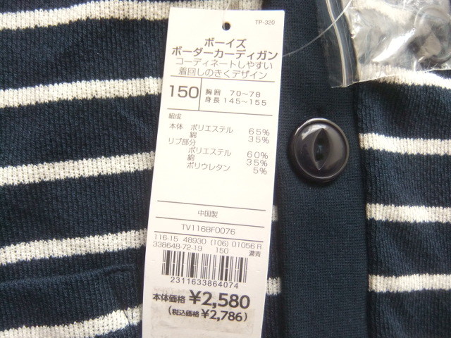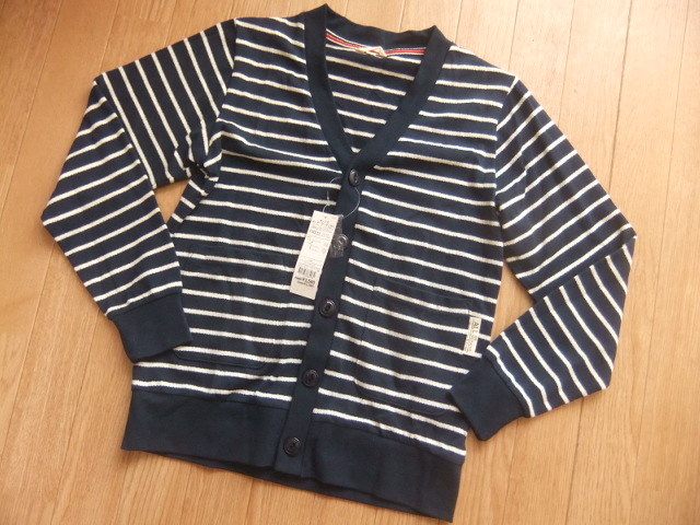 新品タグつきの、着回ししやすい紺地に白のボーダー柄カーディガンです。