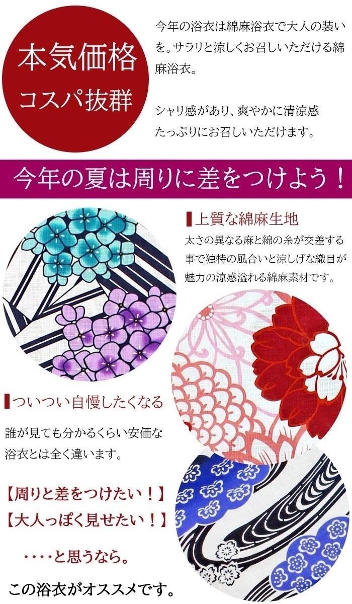 通常の綿だけの浴衣とは異なり、麻のおかげで熱を逃がしやすいため、通気性が良く、また吸水性があり、速乾性にも優れています。1万円越え~5万円くらいの浴衣ラインにしか使われません。