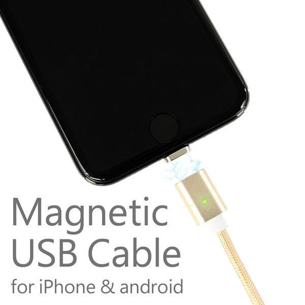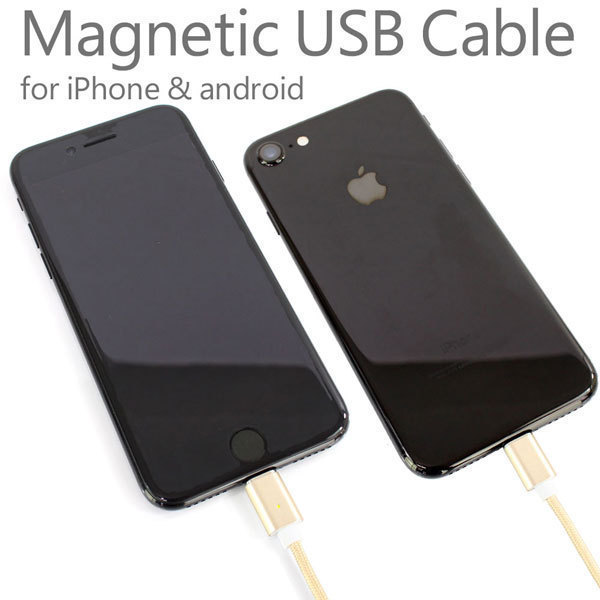 【商品】 マグネット式 マイクロUSB ライトニング 充電 データ通信用 ケーブル ゴールド 【商品説明】 iPhone Android等様々な端末に使える充電、通信可能なUSBケーブルです。 充電端子と充電ケーブルの接続部分がマグネットによる着脱可能となっていますので、近づけるだけで接続可能となっています。 【ご使用方法】 iPhone Android等様々な端末に使える充電、通信可能なUSBケーブルです。 充電端子と充電ケーブルの接続部分がマグネットによる着脱可能となっていますので、近づけるだけで接続可能となっています。 【商品詳細】 2種類の端子が付属、対応 iPhone(Lightning)、Android(MicroUSB)端子が各1個付属なので、両方の端末をお持ちでもご使用できます。 ケーブル1本で2種類の端子に接続可能なので、様々な端末やゲーム機にご使用出来、デスク回りやコンセントの整理にも最適です。 かんたん接続 端子部分がマグネットになっているので、端子の向きに関係なく近づけるだけで片手で接続出来るので、両手が使えない状態でも片手で簡単に接続可能です。 端末の保護、ケーブルの破損防止にもうってつけ 端子部分を端末に差し込んだままご使用可能なので、大切な端末への塵や埃の進入を防ぎ、端子部分の磨耗も防ぎます。 ケーブルを取り外す際に無理に引っ張る事がないので、端子の破損やケーブルの断線防止にもなります。 強力磁石で安心 磁力は端末を持ち上げても落下しない強さなので、充電しながらでも問題なくご使用出来ます。 通電ランプ搭載 通電状態でLEDが点灯するのでひと目で確認できます。 急速充電にも対応 USBの規格は3.0、急速充電(クイックチャージ)にも対応しているのでクイックチャージ充電器にもお使い頂けます。 デザイン性、強度も◎ ケーブル部分はナイロンメッシュなので、デザイン性に優れ、強度もあります。 ※各端子のみのご販売も御座いますので端子が複数必要な場合は別途お買い求め下さい。 セット内容 USBケーブル(100cm) x 1本 MicroUSB端子 x 1個 Lightning端子 x 1個