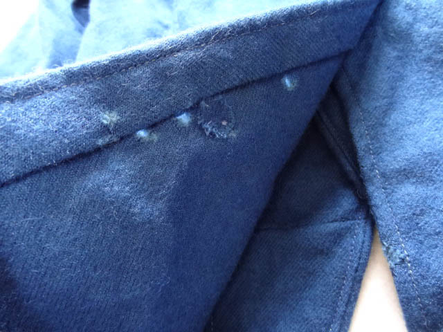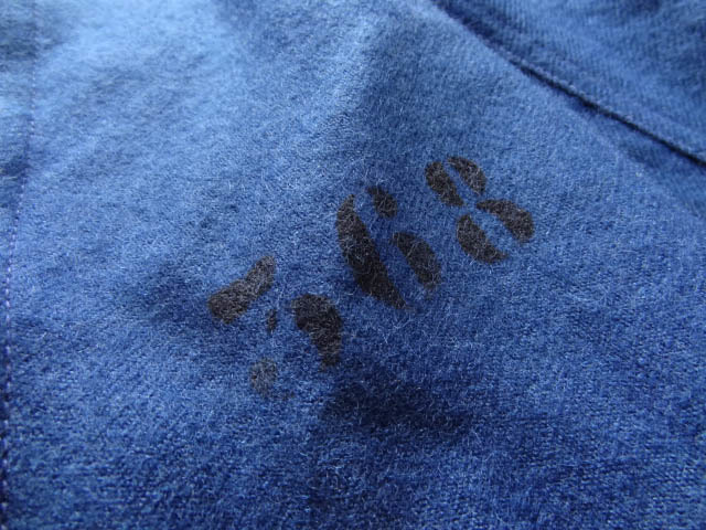 貴重なスモールサイズです。おそらくは「2」くらいだと思います。大きいものしか出てこないのでスモールサイズはレアです。さらには個人的にもこれしか見たことのないステンシル付です。実はJKT以外はもう全て手放しましたが,こちらはジャケット、ベスト,パンツ,シューズの4ピースでコレクションしていたものになります。パンツとジャケットに同じステンシルが付いていたので,オリジナルであるという見方で間違いはないと思います。数えきれないほどのホスピタルジャケットを見てきましたがステンシル付きはこれ以外には見たことがありません