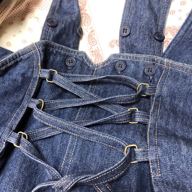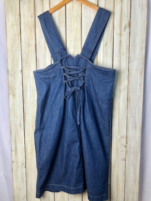 ●商品説明・・・80年代頃のレトロなデニムのジャンパースカートです。変形パターンのフロントホックや後ろのレースアップが可愛い一着です。肩ひも部分はボタンで2段階調整できるようになっており、ウエスト部分も後ろのレースで絞れるようになっています。素材はコットンです。