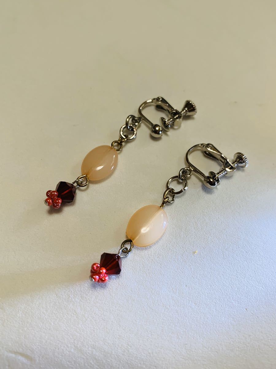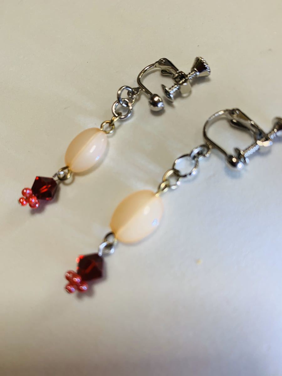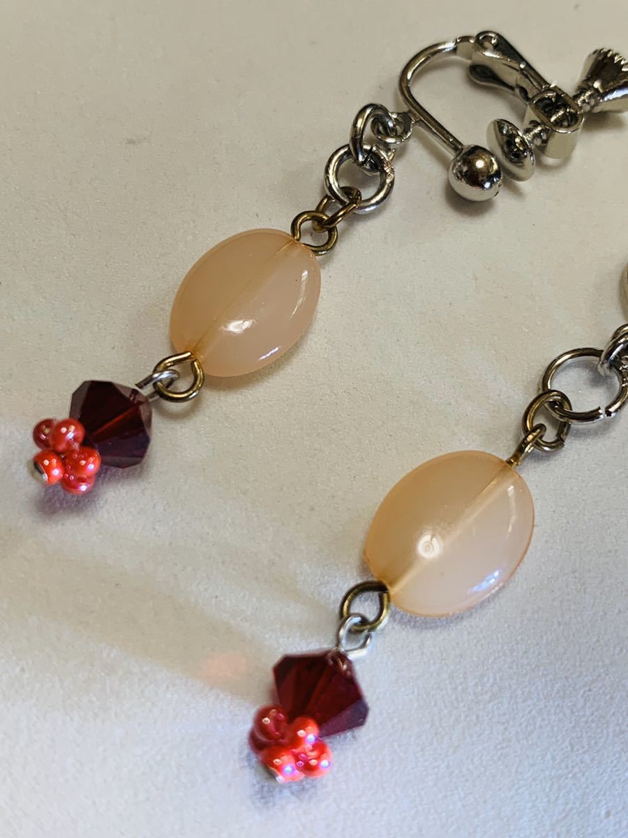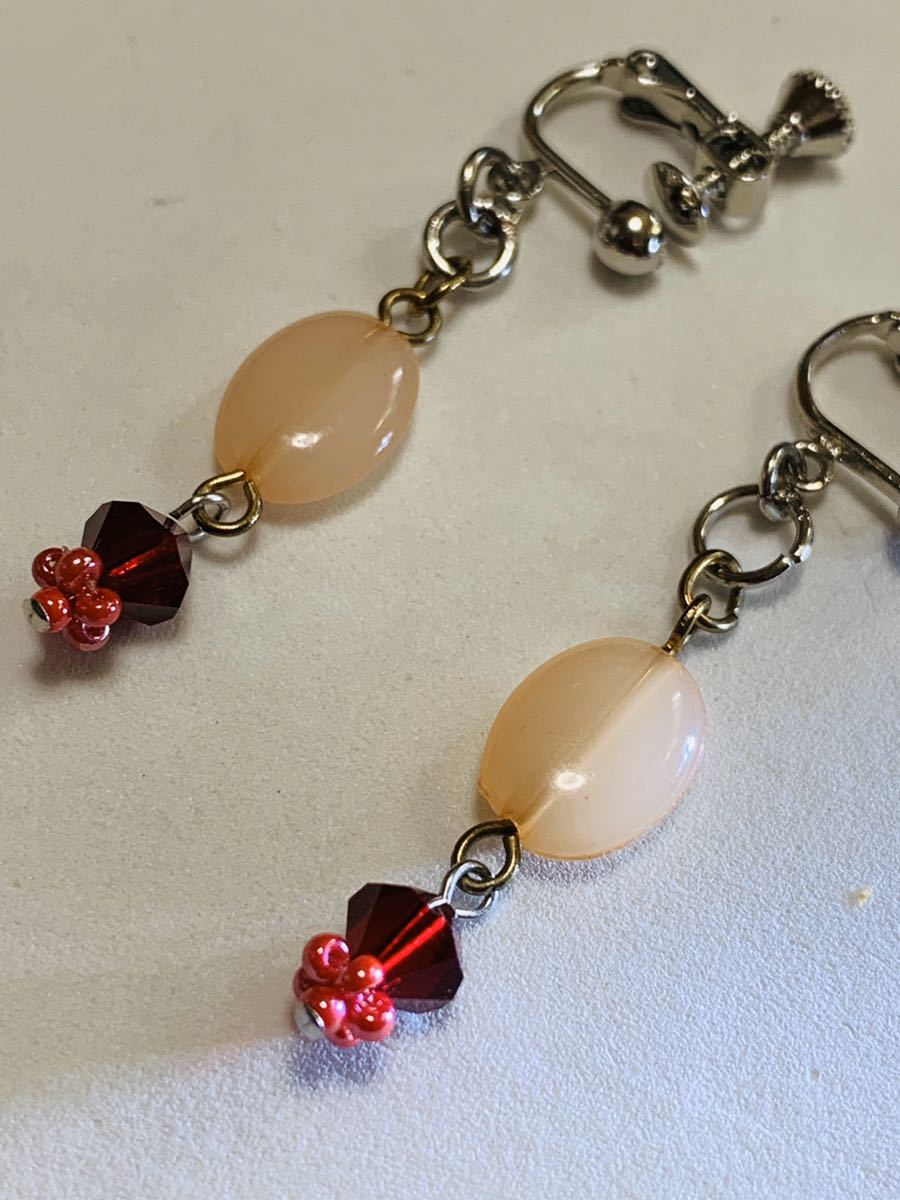 ピンク水晶と天然石とビーズのイヤリングです、天然石和、ビーズと天然石の赤色の可愛いイヤリングです、トップのサイズは35×10ミリ、イヤリングの様式はネジバネ式です