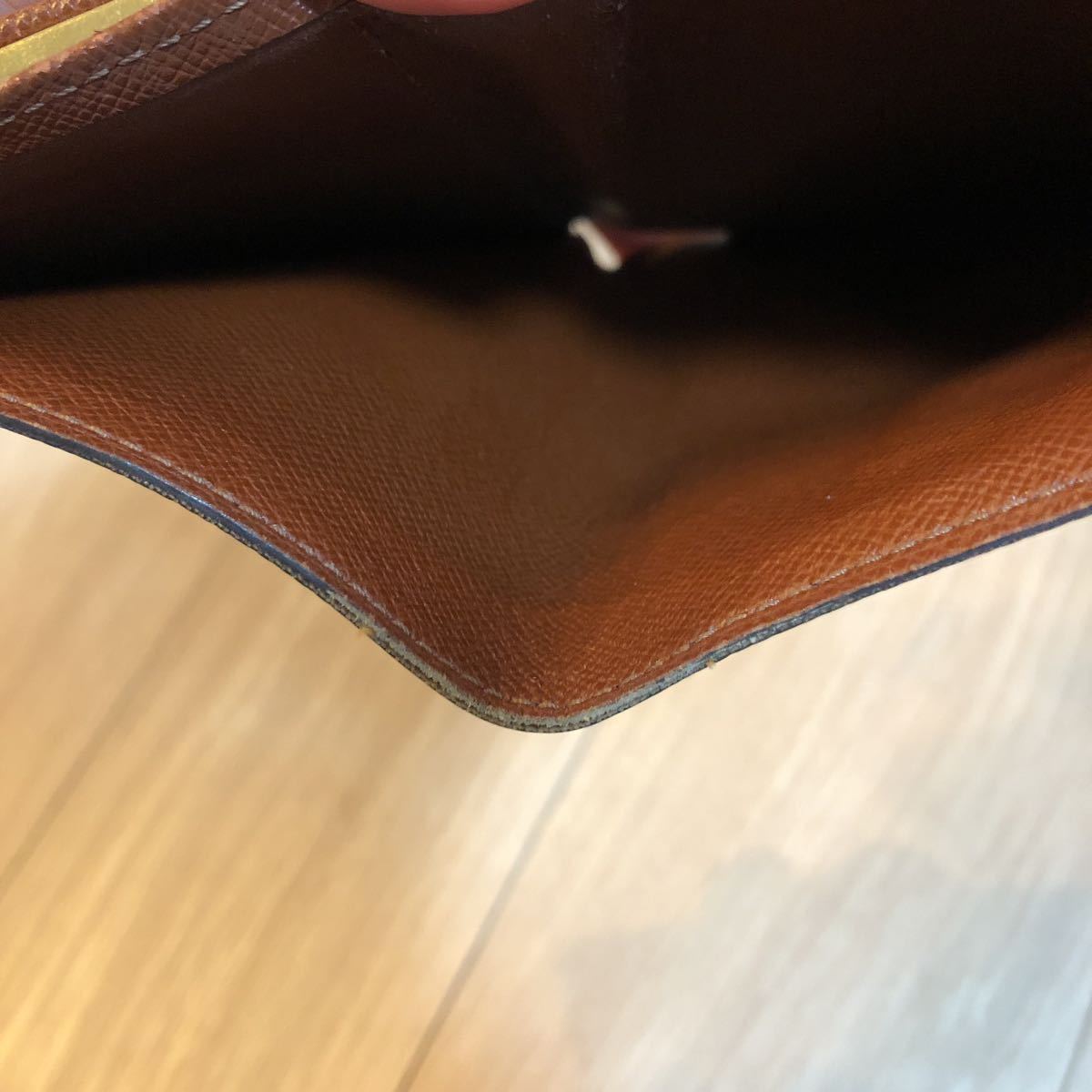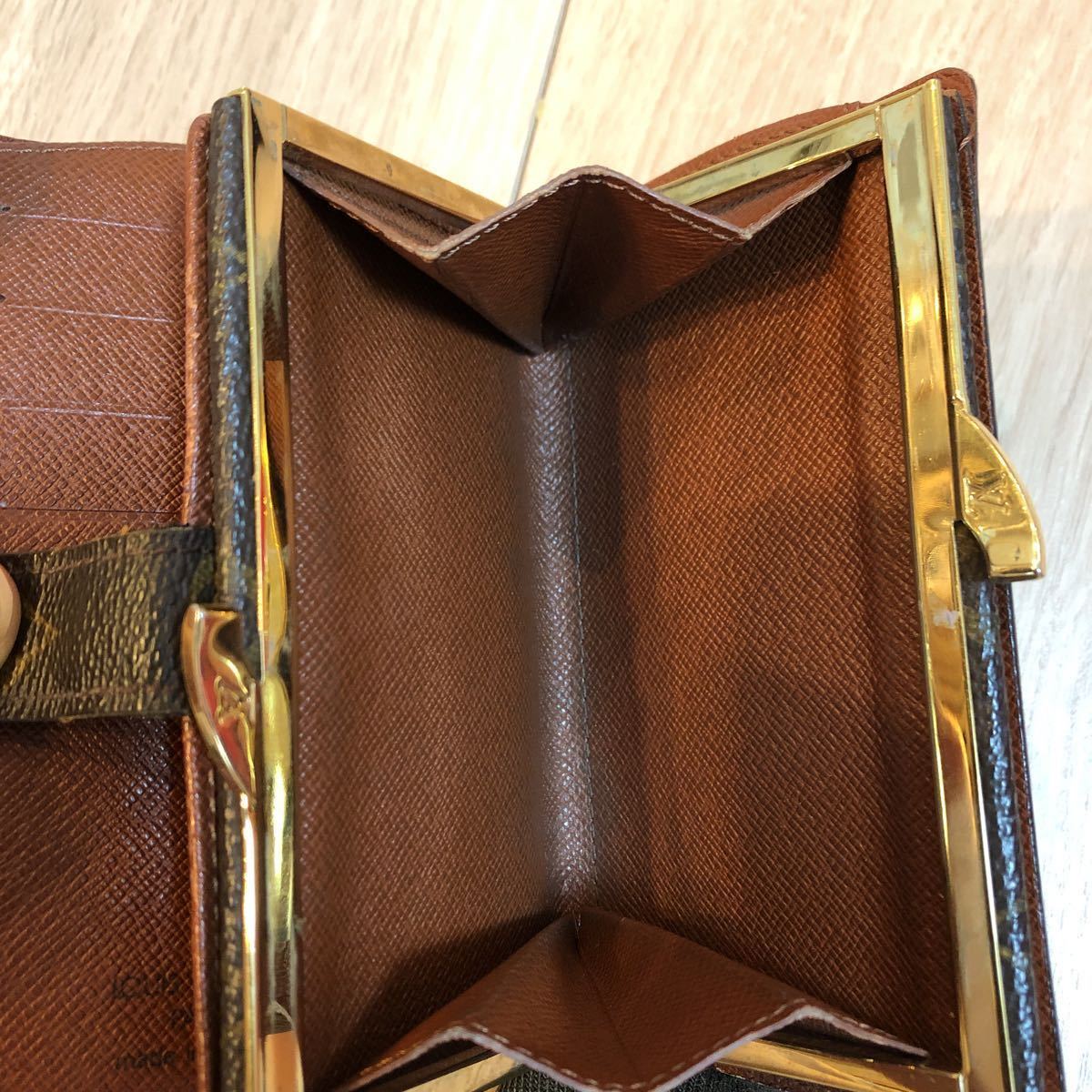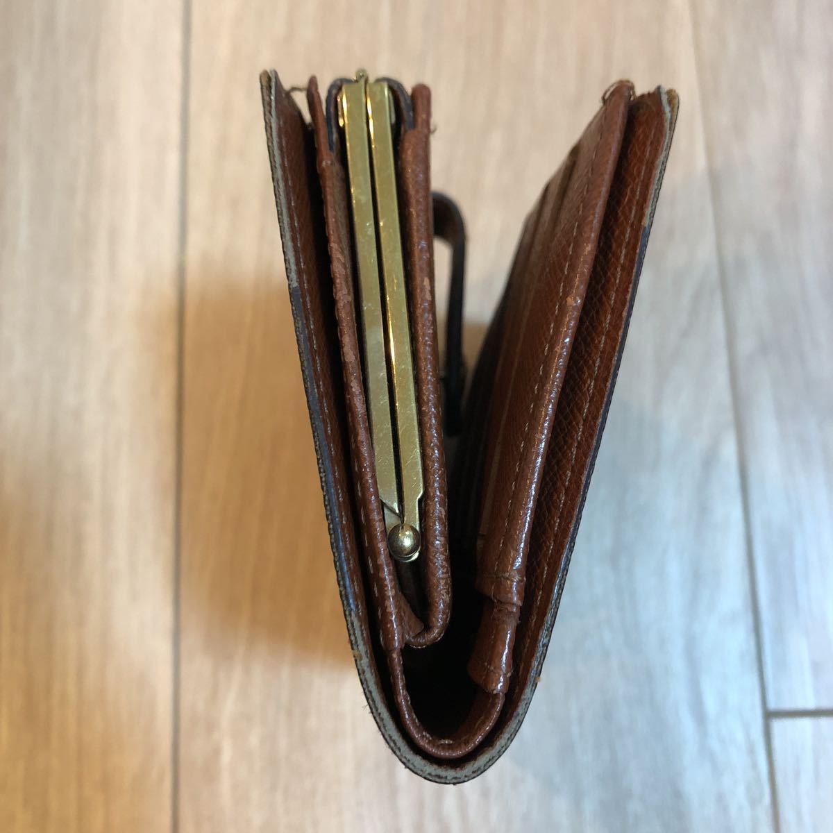 とても大切に使っていましたので、目立つ汚れベタつきはありませんが角スレがございます。がま口のホックはパチンと閉まります。お札入れの部分の縫い目に小さなほつれが見られます。写真にてご確認ください。