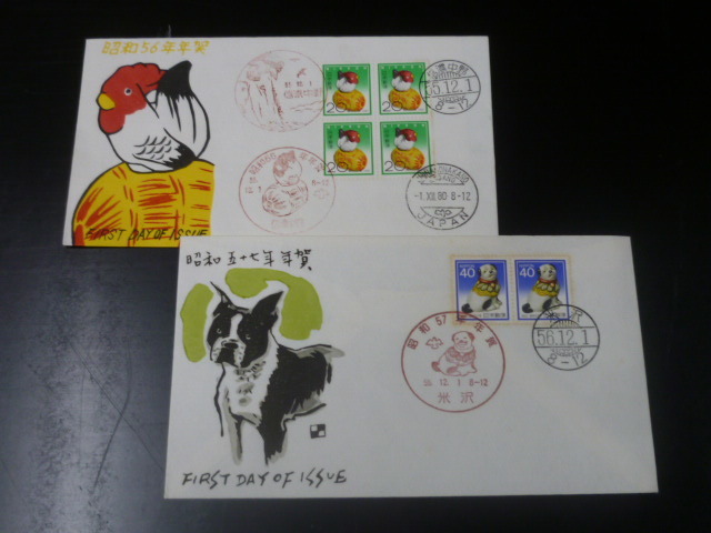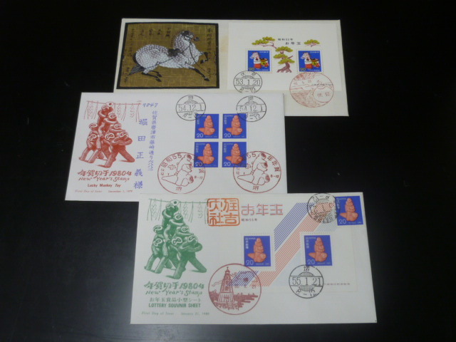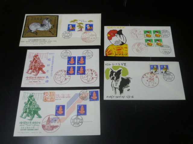 19 F№63D 日本 初日カバー 年賀 1977-81年 飾り馬~犬 ペア・田型貼・他 計5通