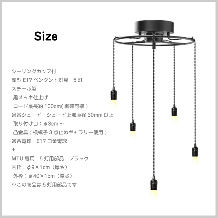 カフェやお店の照明としても大人気!! ディスプレイも兼ねたおしゃれ照明をお探しなら。 裸電球のシンプルな照明は、お好きな長さに調整可能。 合わせやすいブラックを基調とした照明で、ガラリと模様替えしてみては♪ LED調光タイプの電球が付属しております。 ※灯具と電球の間に傾きやガタつきなどがある場合が御座いますが、ご使用には問題御座いません。 ※キズ・へこみ等がある場合が御座います。(製造過程)【写真参照】 ※返品・交換対象外となります。 ■ ■ 商品情報 ■ ■ 【サイズ】コード最長約100cm(調整可能) ≪適合シェード≫シェード上部直径30mm以上 ≪取り付け口≫φ3cm~ ≪凸金具≫(横螺子3点止めギャラリー使用) ≪適合電球≫E17口金電球 ・内枠:φ9×1cm(厚さ) ・外枠:φ40×1cm(厚さ) | |||
