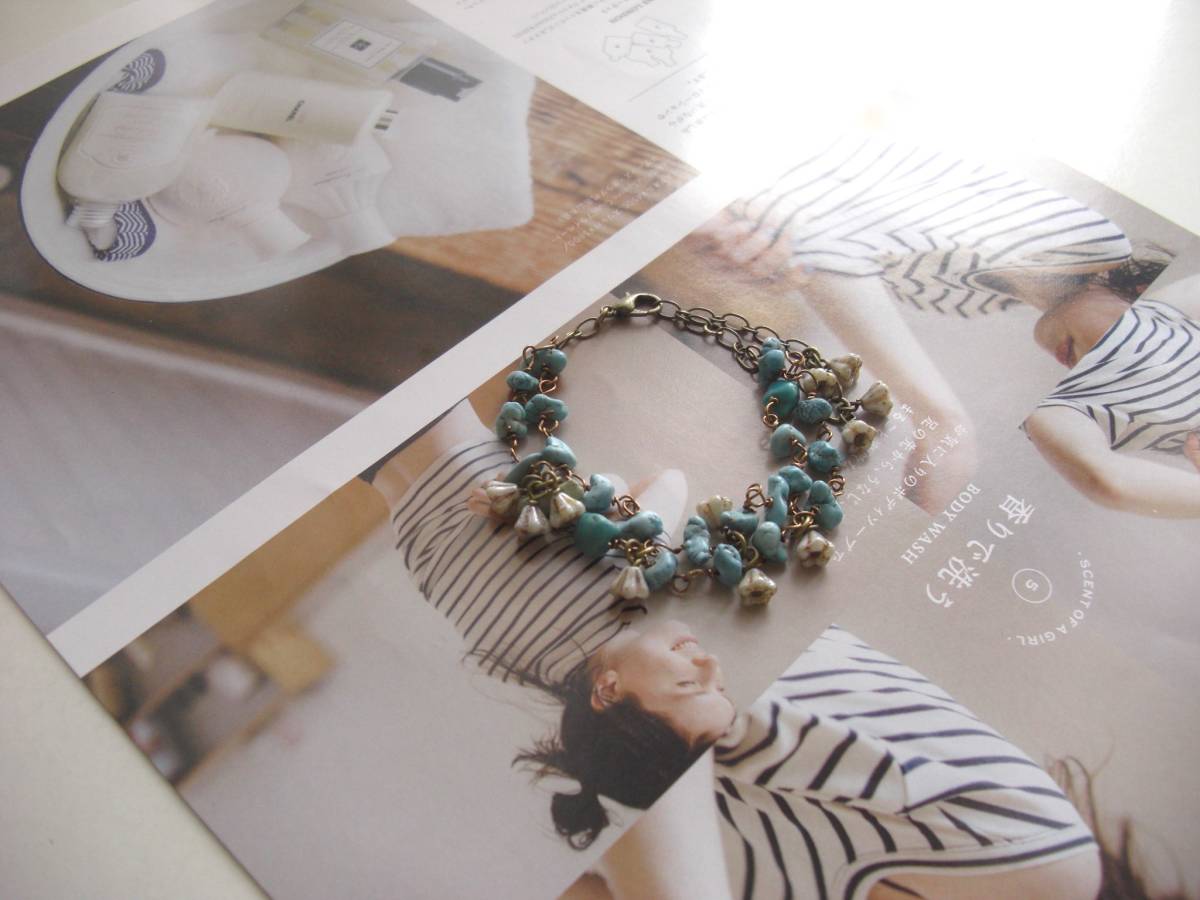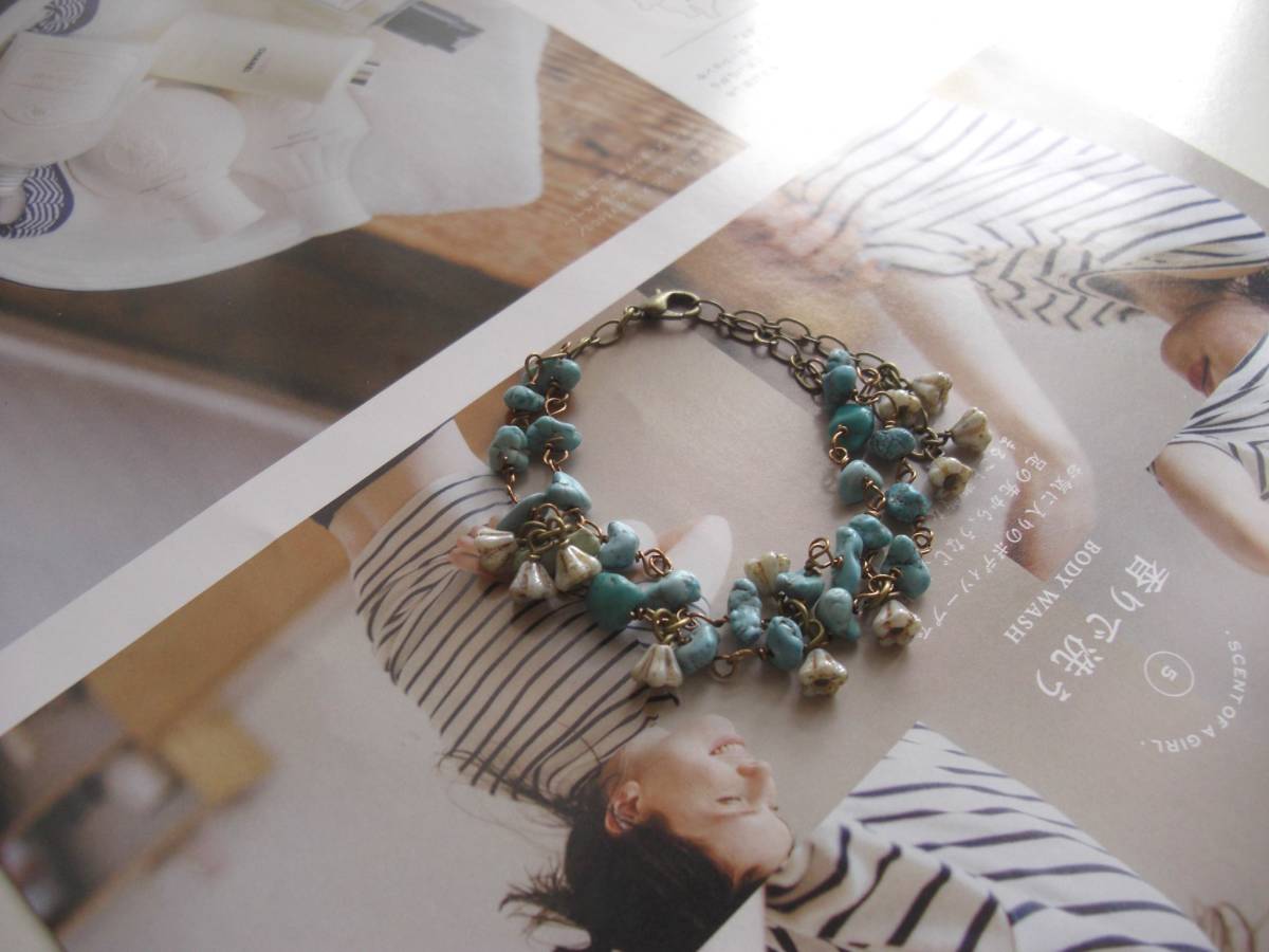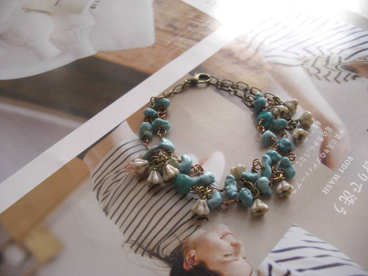 初夏の色を+して・・シリーズです♪可憐なターコイズ・・ターコイズとチェコのお花の2連のブレスレットです♪さざれのターコイズに小さなチェコのお花を合 わせて可憐な表情です♪ターコイズは6ミリから7ミリ位までのさざれです♪長さは全長23センチ位で調節自由です♪お揃 いのネックレスも出品しています♪シン プルで飽きのこないいつまでも着けられるデザインを考えて作りました!ハンドメイドをご理解頂いてノークレーム、ノーリターンでお願いします