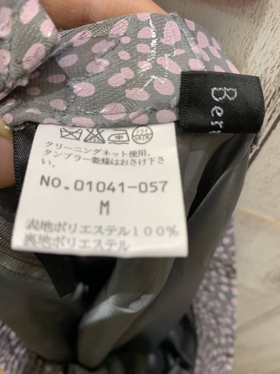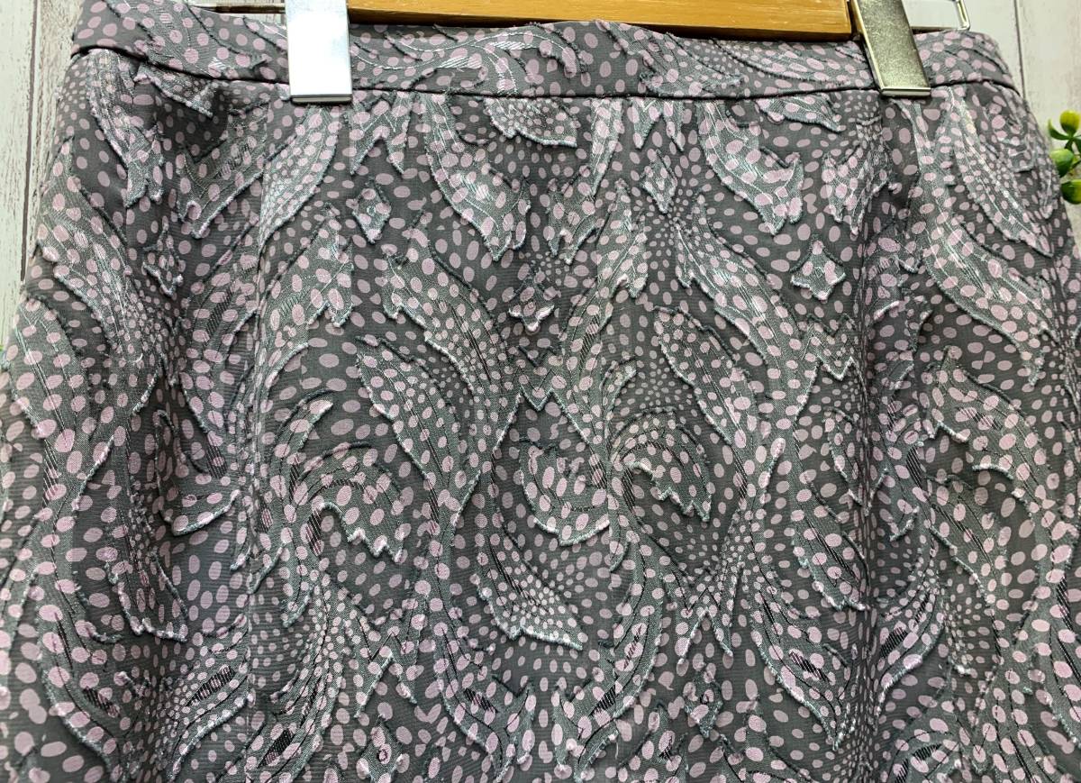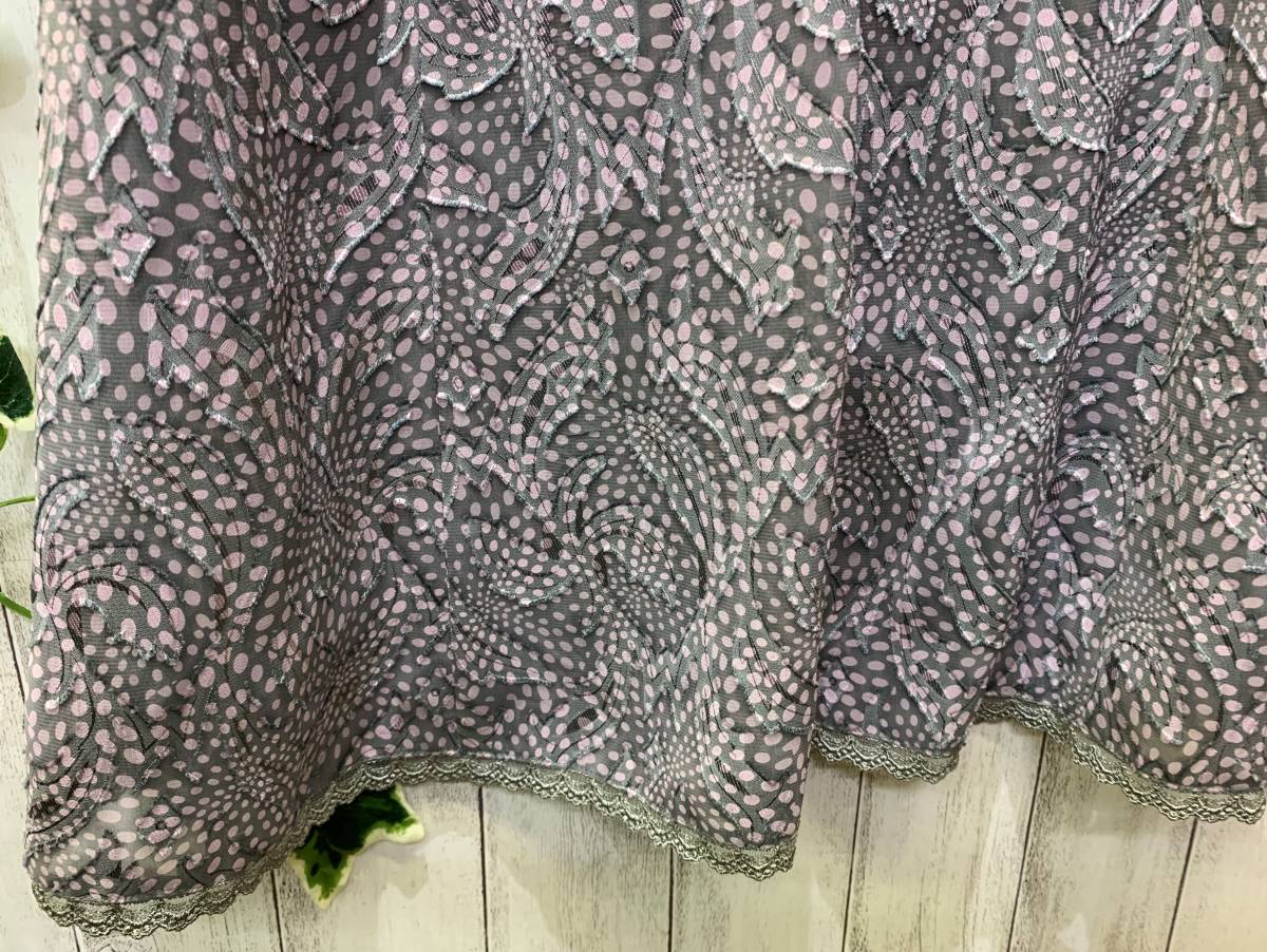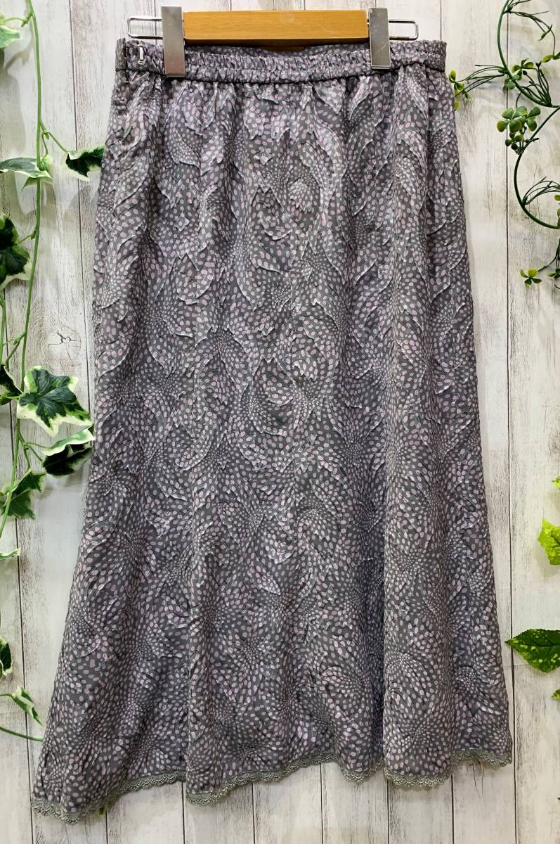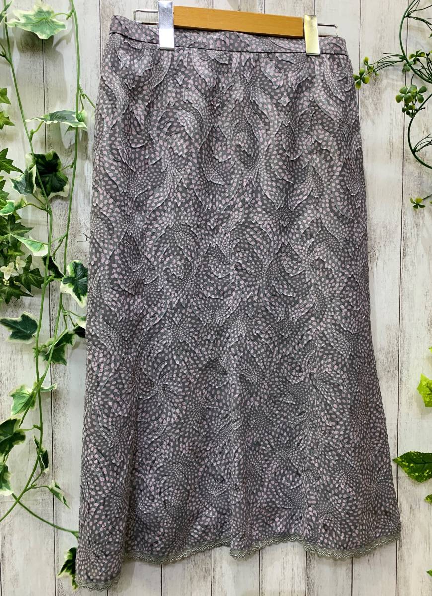 グレー地にピンクの水玉、裾には同色のレースをあしらったとてもかわいいフェミニンスカートです。