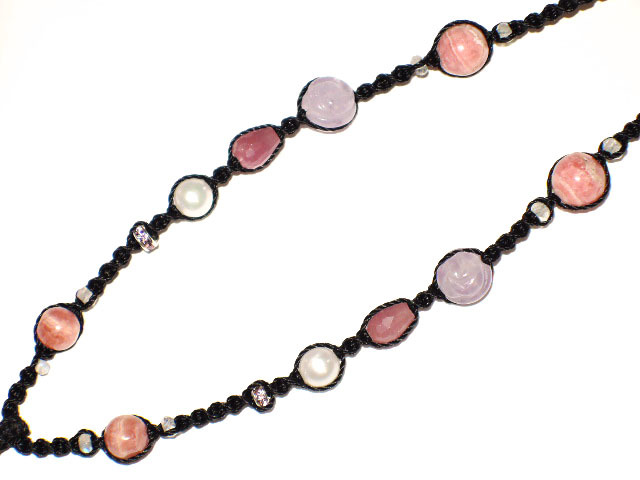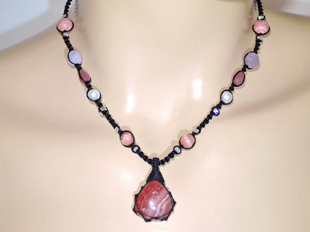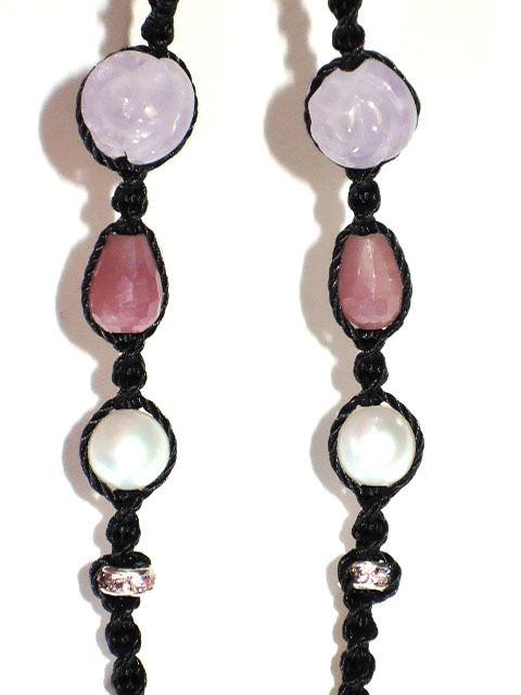 このネックレスはマクラメ編みとゆう手法で編んでいます。