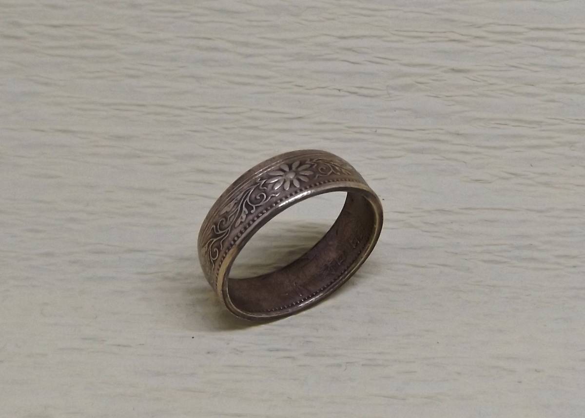 この商品は、昭和11年発行の桐1銭青銅貨を使用。銅貨に穴を明け木槌で叩いてコインリングに成形した1点ものです。