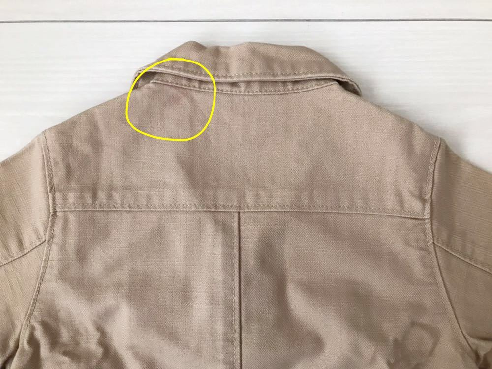 後ろ襟の近くにピンクっぽいシミがあります。(画像5枚目参照)