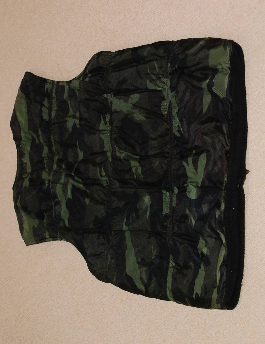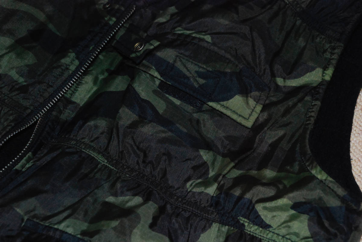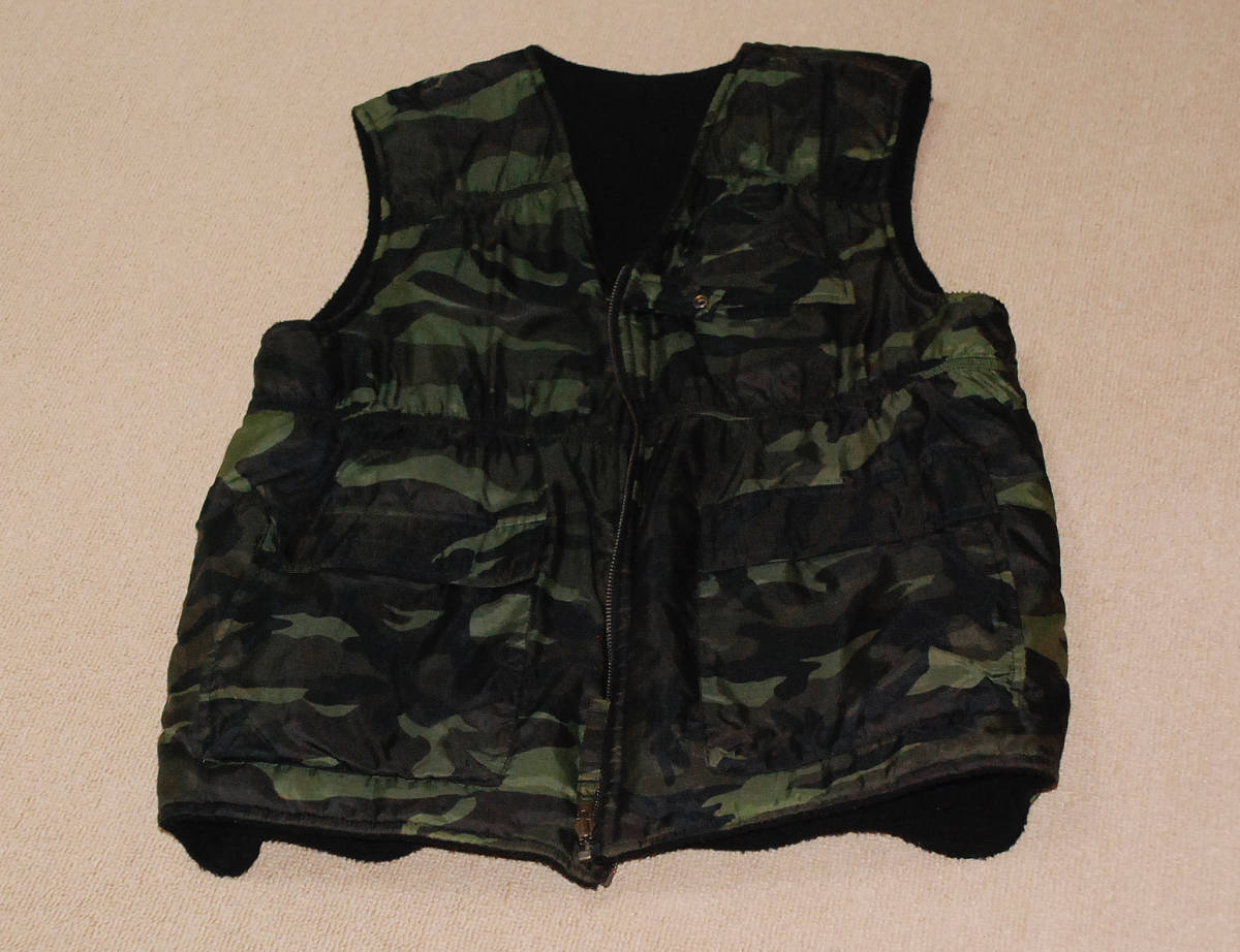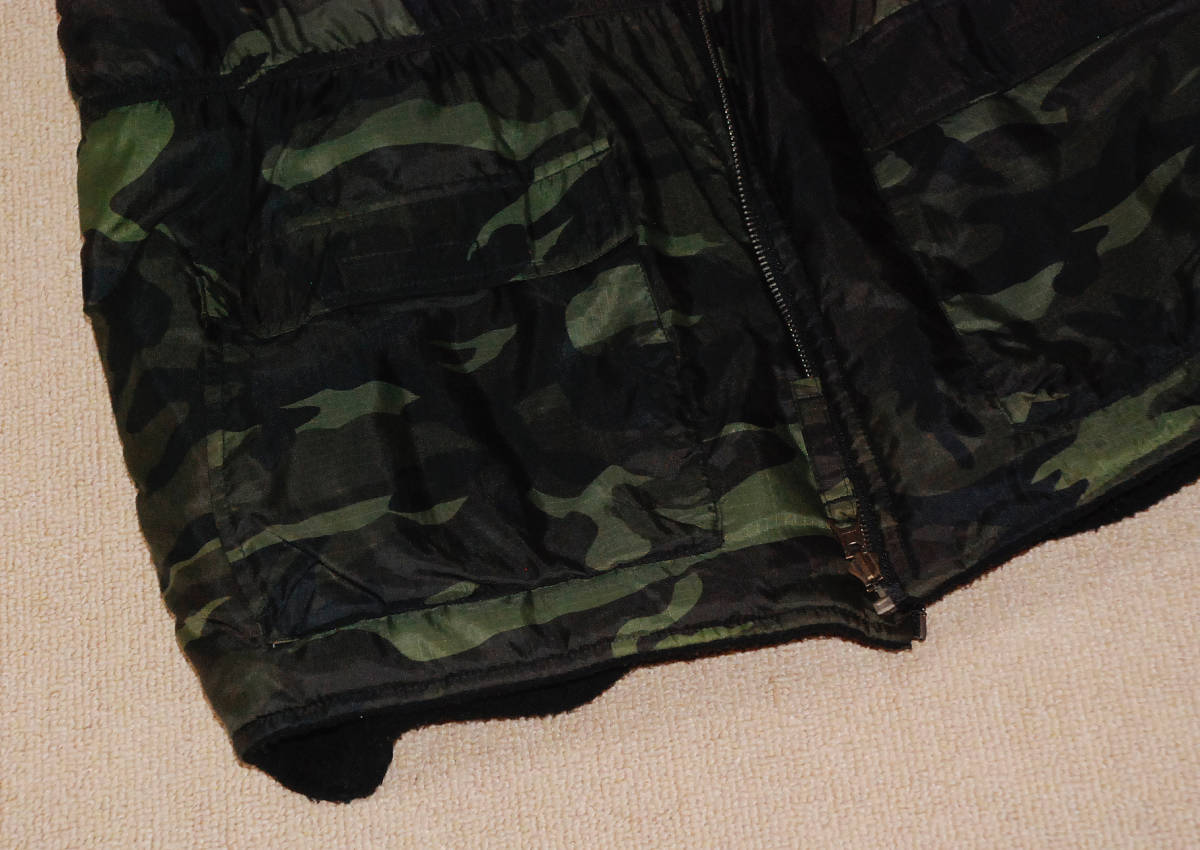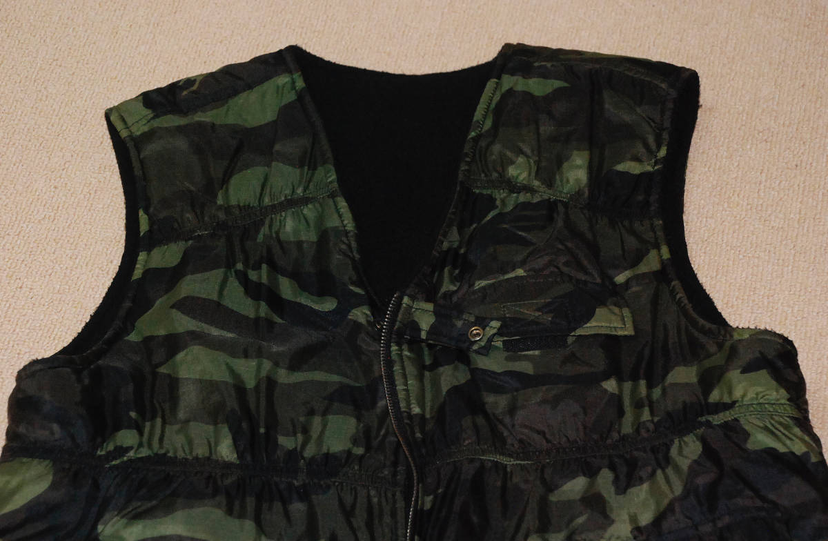 秋冬の寒い時期の防寒具、毛布仕立ての裏起毛ボア付きベストです。 迷彩柄の外柄に、内側黒色のボア。