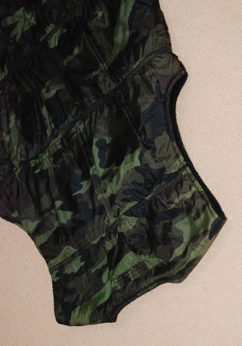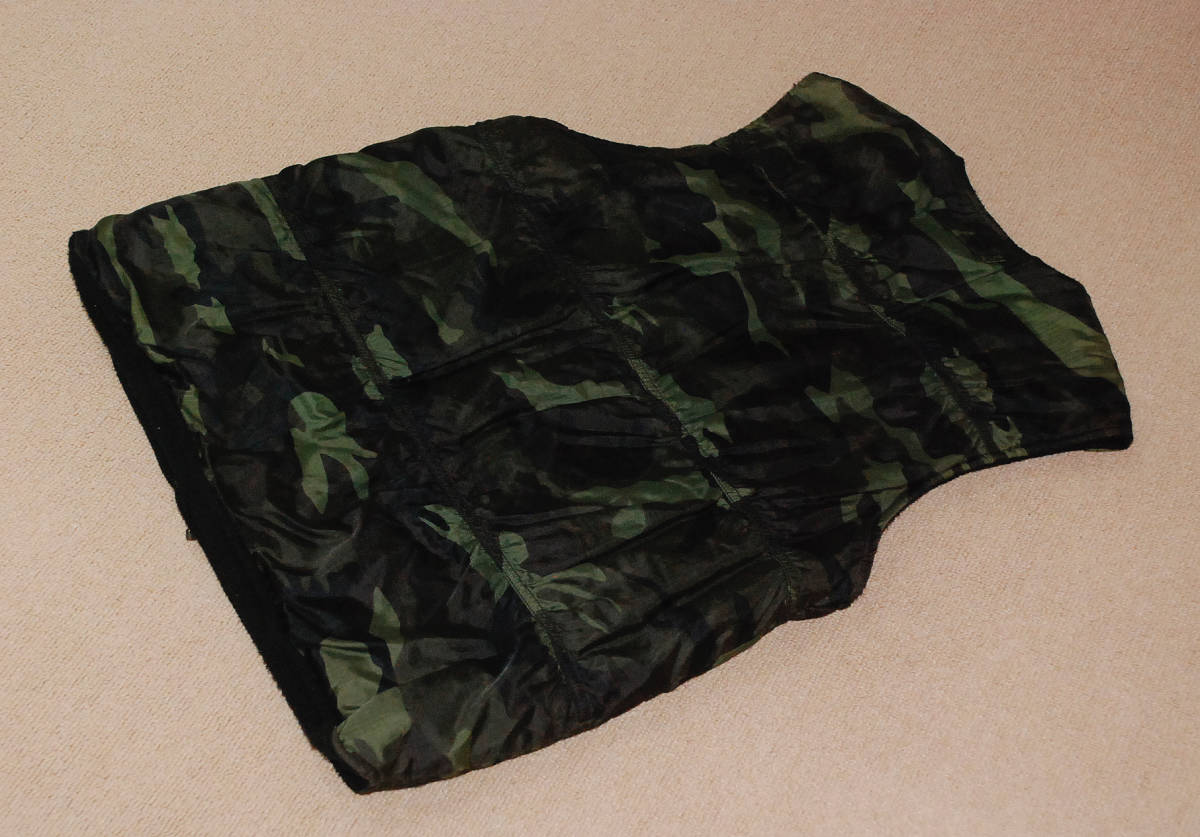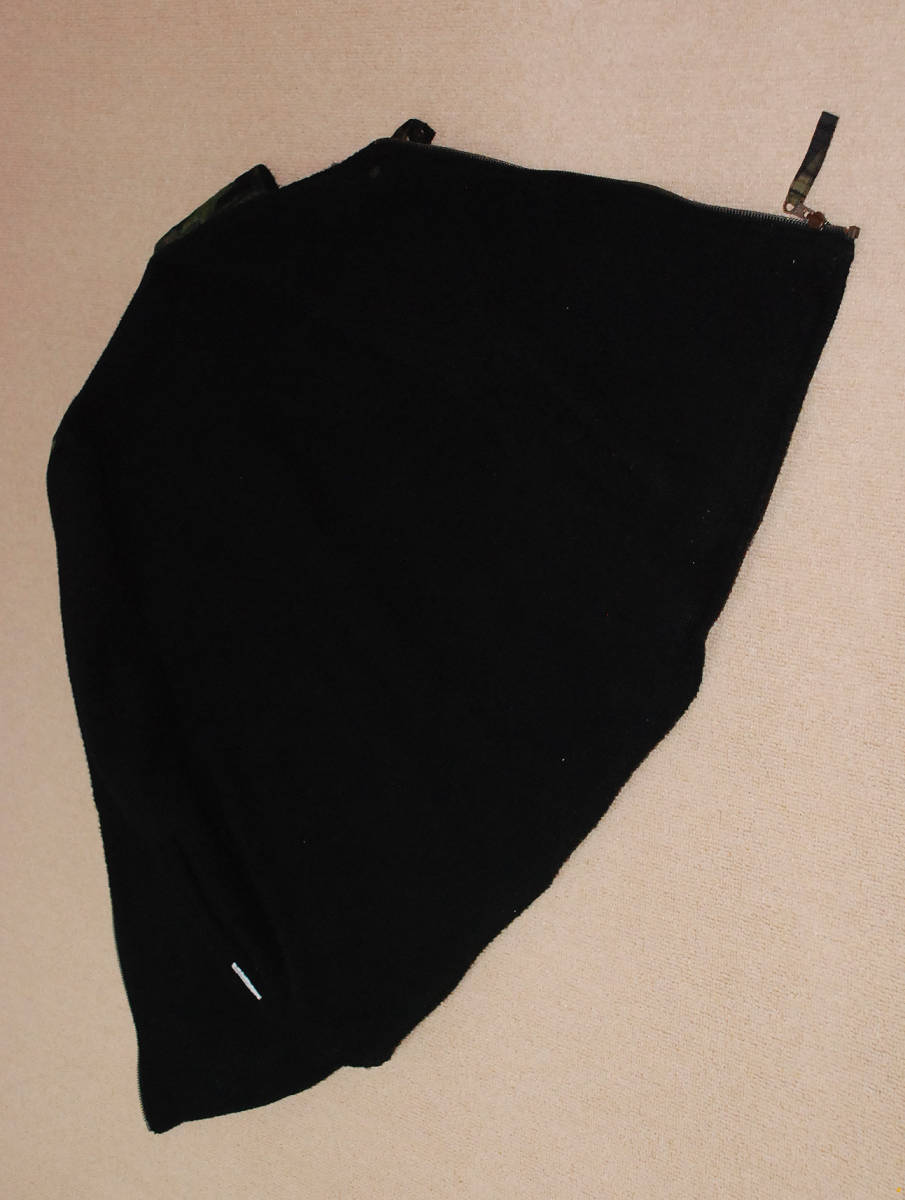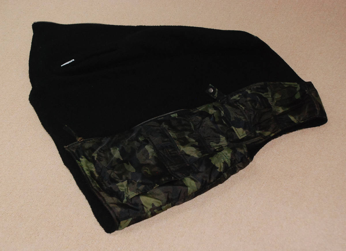 秋冬の寒い時期の防寒具、毛布仕立ての裏起毛ボア付きベストです。 迷彩柄の外柄に、内側黒色のボア。