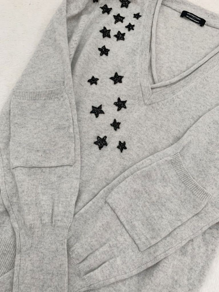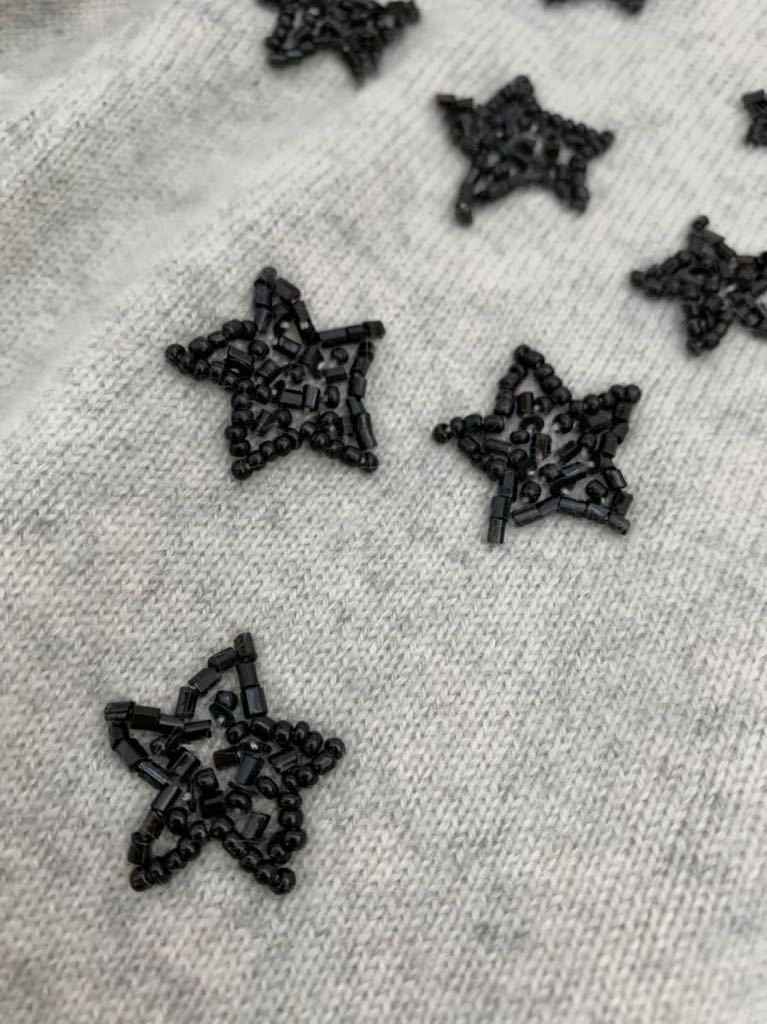 ・ふんわり柔らかな上質カシミアを使い計算されたシルエットにビーズの刺繍使いやミリタリー調のデザインがとてもお洒落なセーターです。