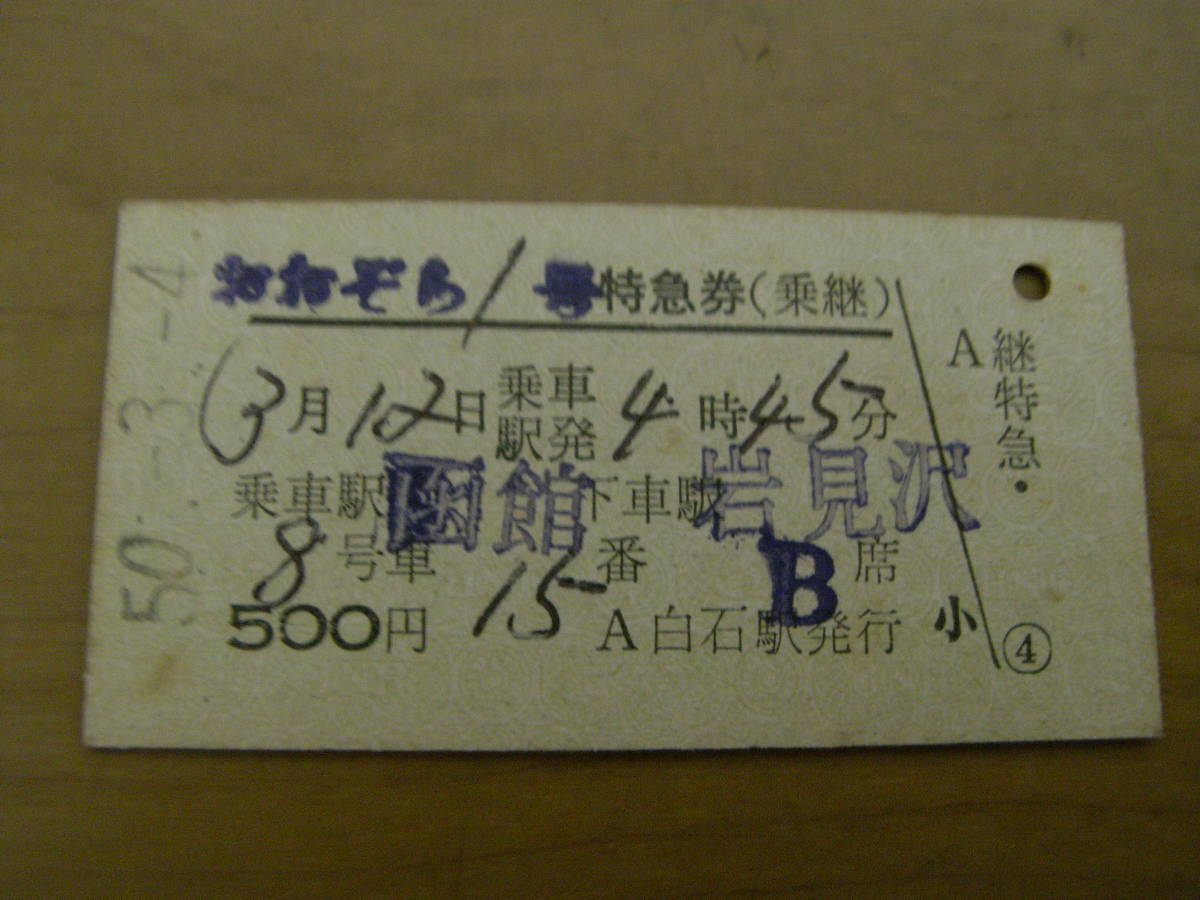 おおぞら1号 特急券(乗継) 乗車駅 函館 下車駅 岩見沢 昭和50年3月4日 白石駅発行