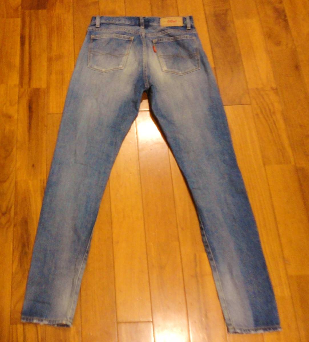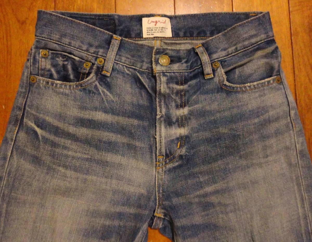 アングリッドのデニム(ジーンズ)、111621429301です。色はインディゴブルーです。USEDですが状態は良いです(10段階中8程度)。紙パッチ、赤耳、ジッパーフライ、チェーンステッチです。生地は綿100%です。正規品です(MARK STYLER(株)、日本製)。サイズはW24でウエストは重ねずに平置きで約72cm、ヒップ約91cm、股上約25cm、股下約77cm、股下15cmのふともも部分約46cm、裾まわり約28cm、重量約460gです。発送はゆうパケットポストになります。