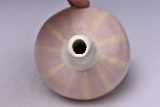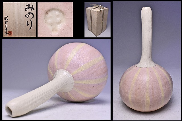 武田由希子 ★ 色絵鶴首壺 ★ 銘: みのり ★ 共箱 ★ 女性らしい優しい色使いが美しい逸品 ★ 華道具 ★