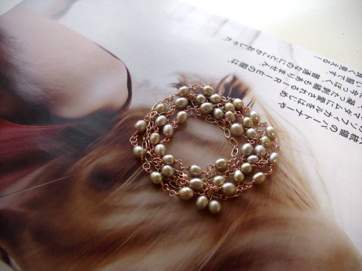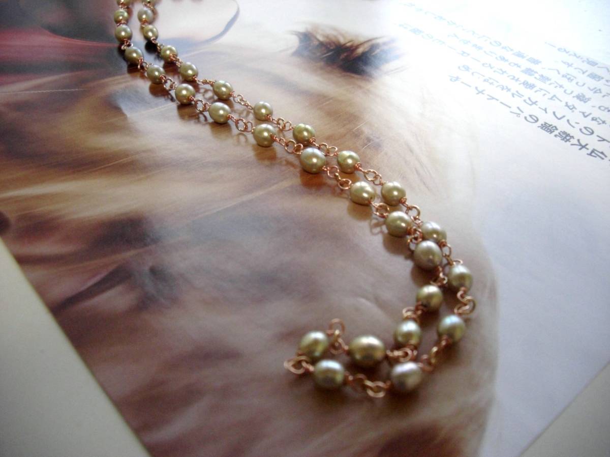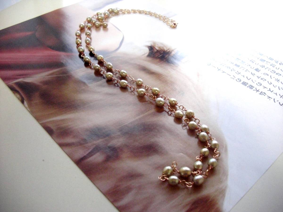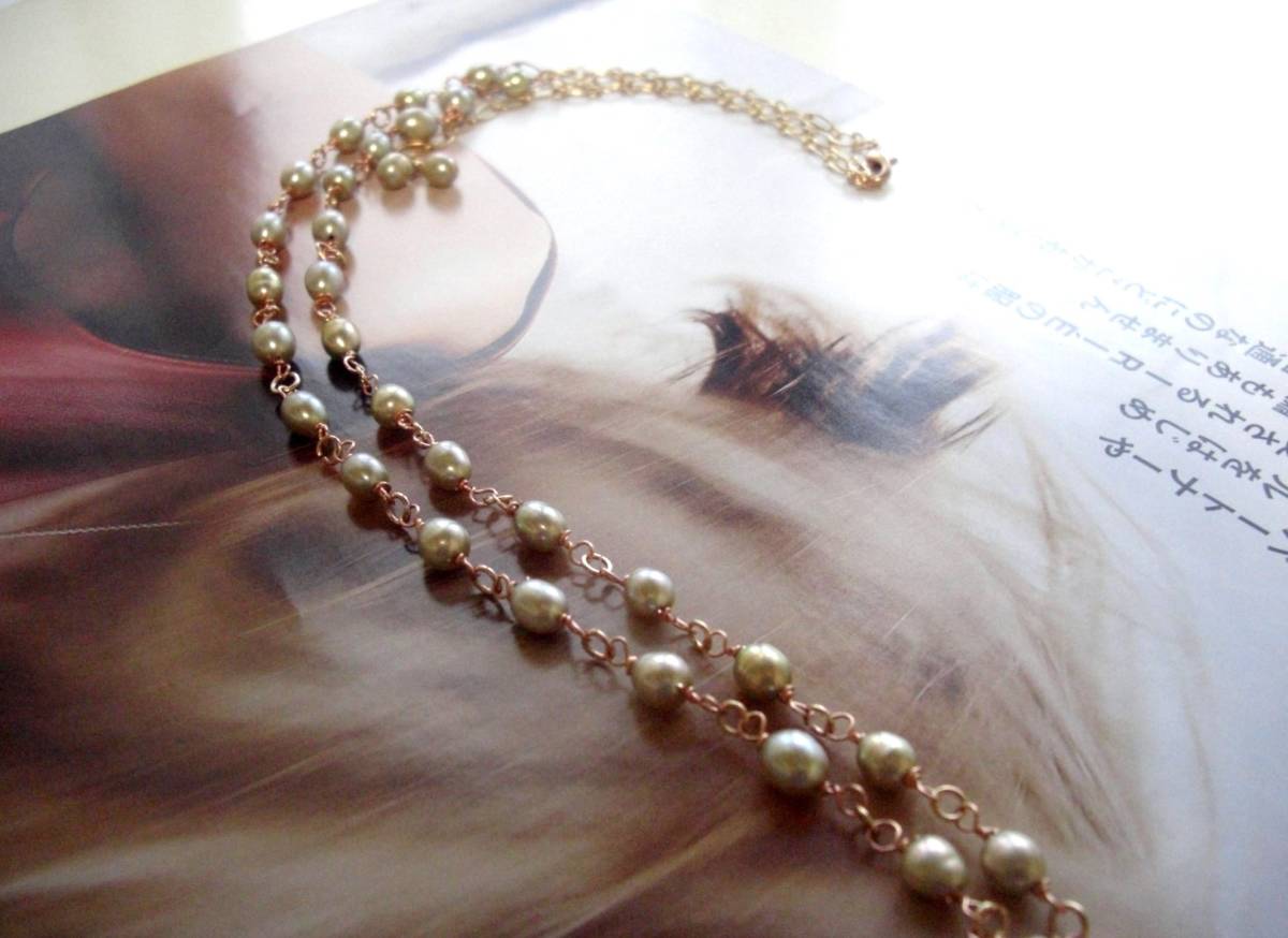 着ける幸せ・・シリーズです♪飾らないパール・・ナチュラルな淡水パールのネックレスです♪シャンパンベージュのパールにピンク ゴールドのチェーンを合わせてロマンチックしています♪パールは表情豊かなバロックパールなのでシンプルなデザインに仕立てました♪♪6×8ミリ位の小粒のパールのネックレスは全長 100センチ位で調節自由です♪2連にされたり画像のようにブレスレットにされても可愛いです♪お揃いのネックレスやブレスレットやピアスも出品しています♪ハ ンドメイドを ご理解頂いてノークレーム、ノーリターンでお願いします