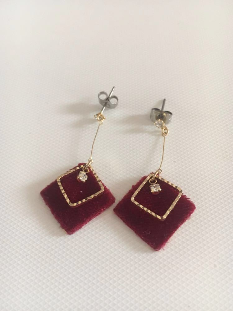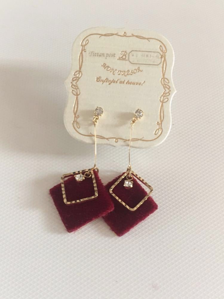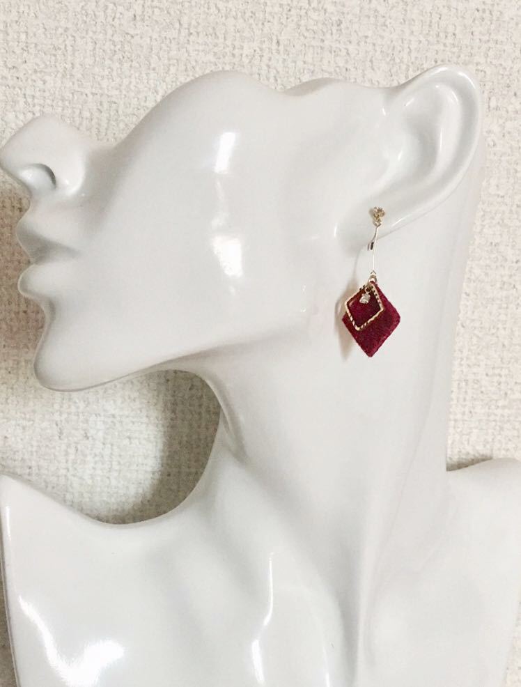 こちらは、BELLY BUTTON 、赤いフェルト地にキラキラしたストーンと、ひし形のゴールドカラー のピアスになります♪
