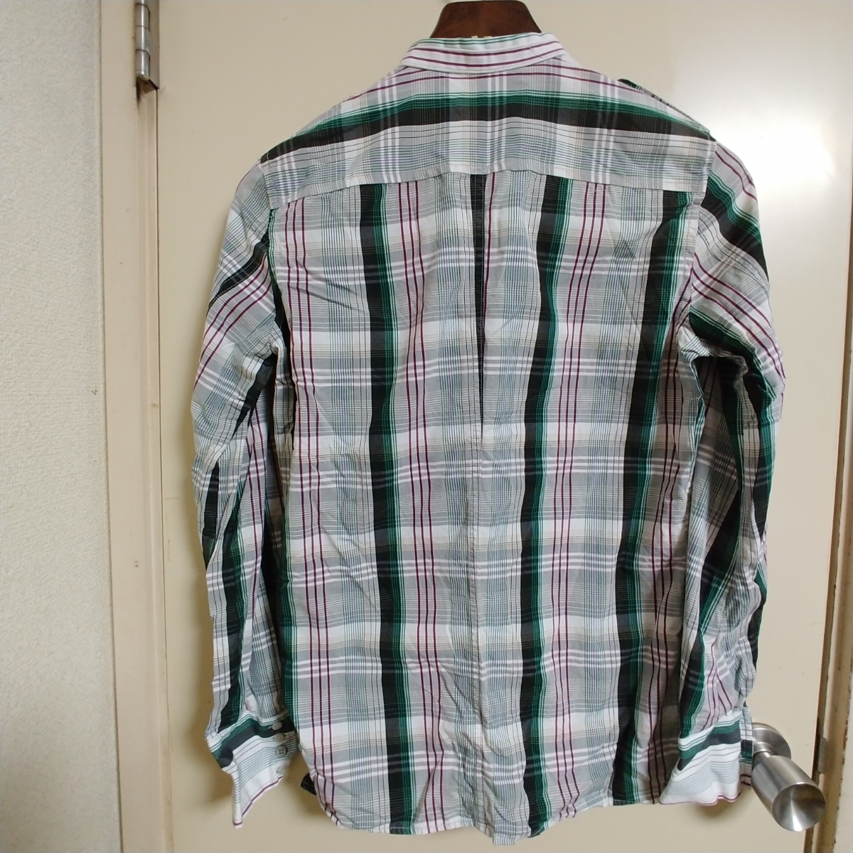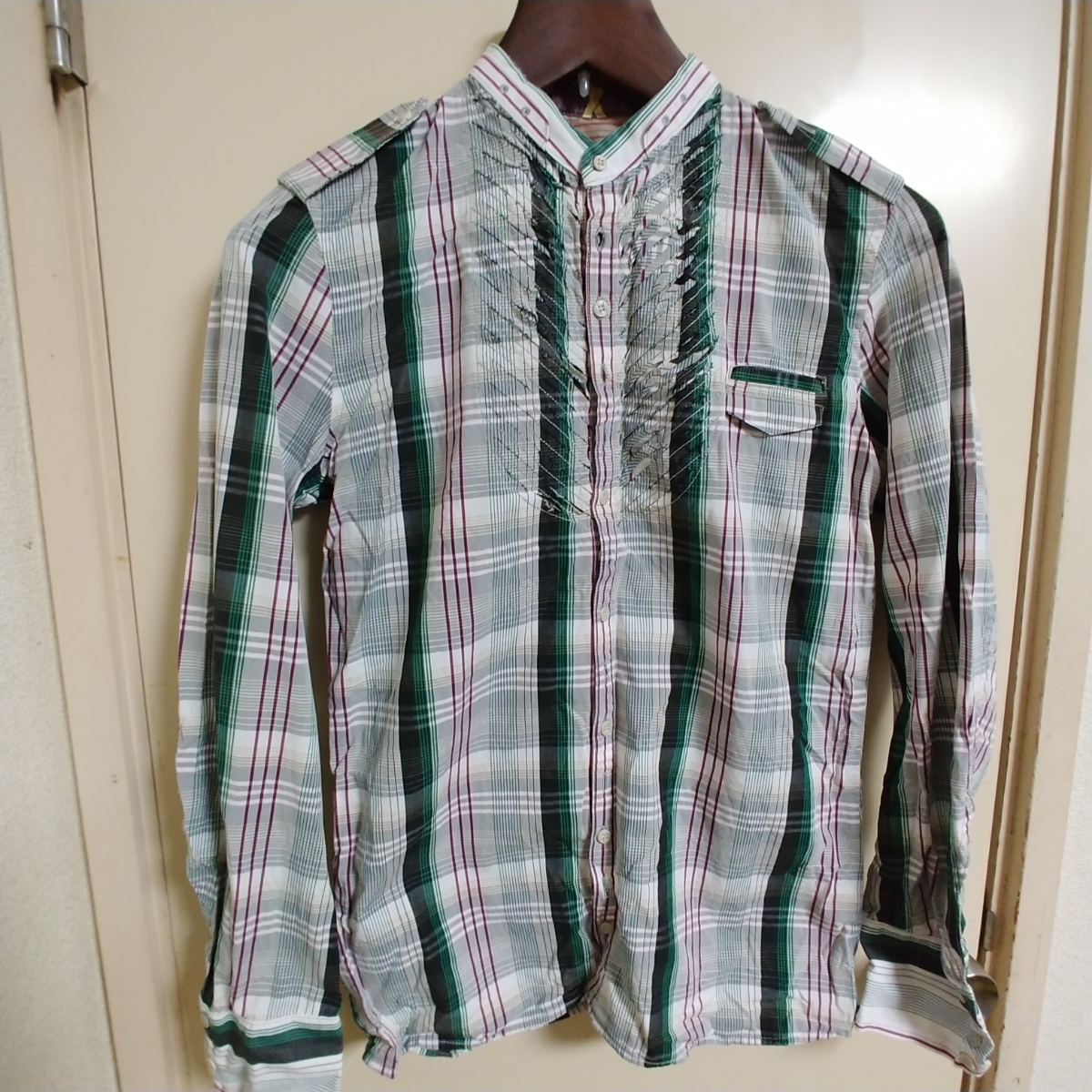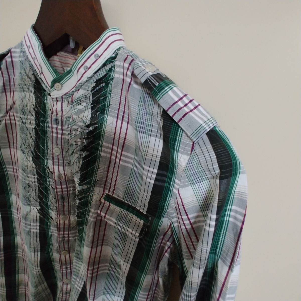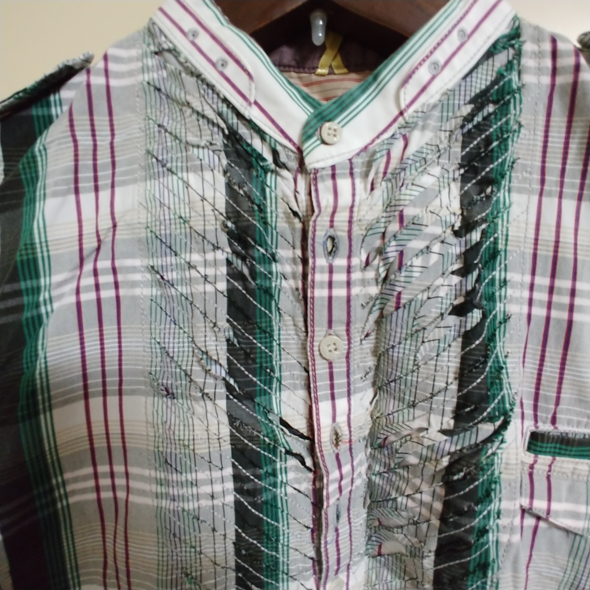 胸元のクラッシュ加工や変則的なチェック柄が目を惹きます。