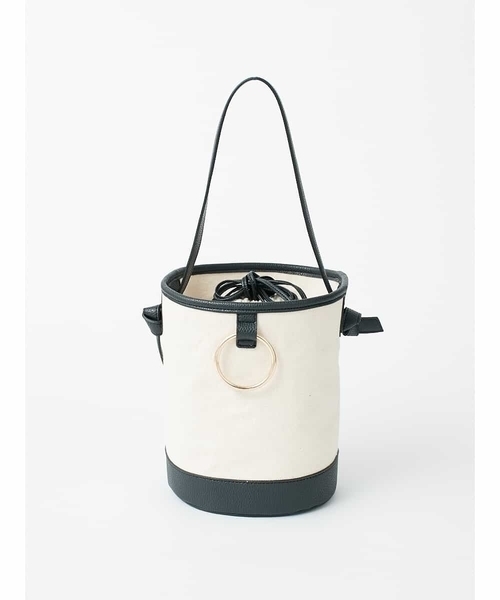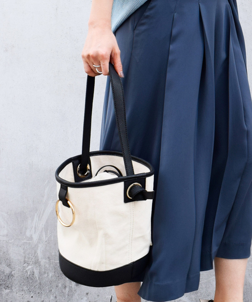 ■バケツ型デザインがトレンド感たっぷりのワンハンドルバッグ。キャンバス地のナチュラルな風合いが大人カジュアルな気分にぴったり。巾着型のライナー仕様で中身が見えず出し入れもしやすいのがポイント。フロントのリングデザインもワンポイントに。着こなしのアクセントにアクセサリー感覚で持ちたい大人カジュアルバッグです。