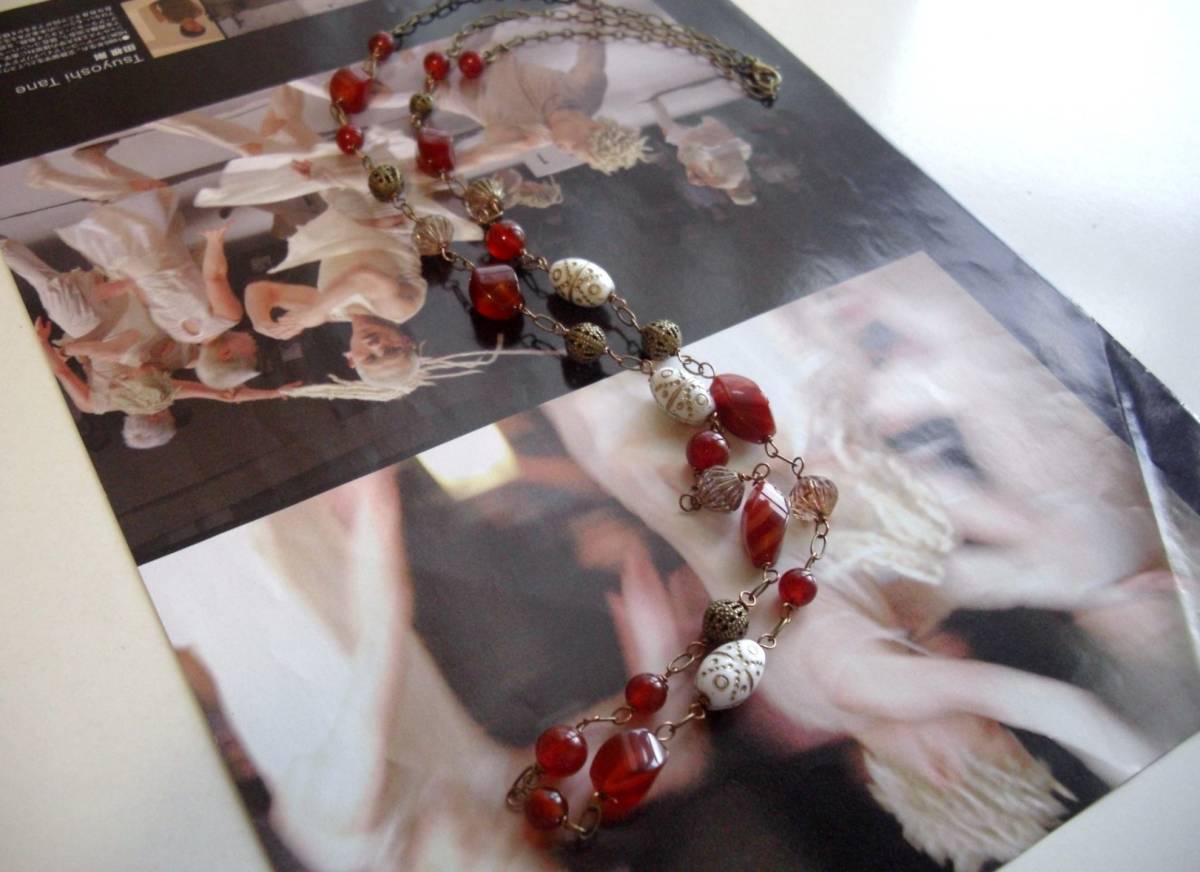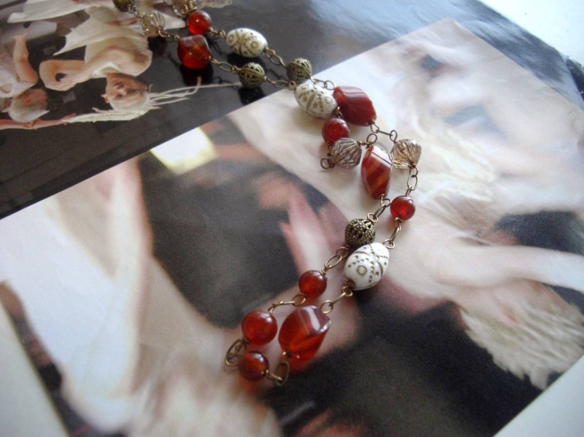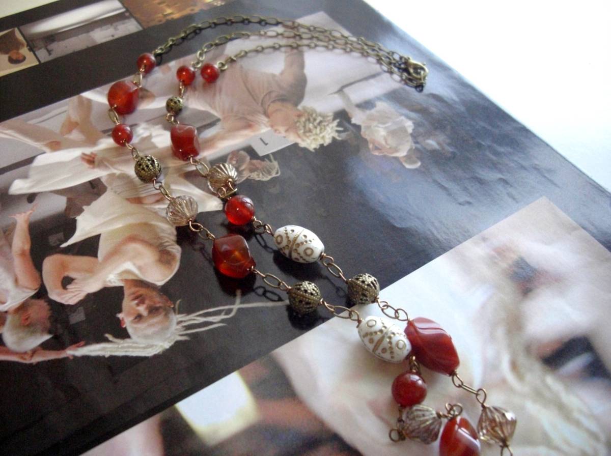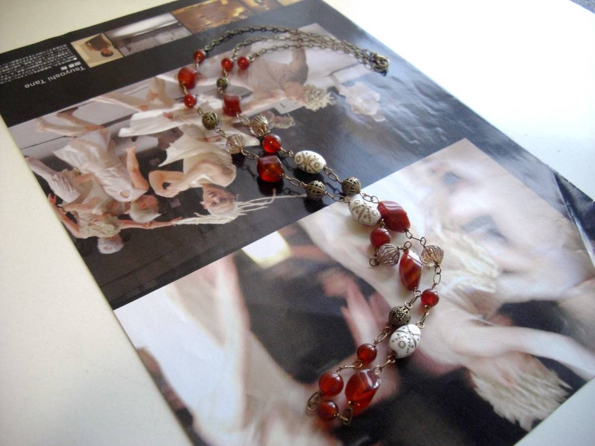 モダン・ガール・・シリーズでス♪シックなカーネリアン・シックなカーネリアンのネックレスです♪6ミリ、8ミリの丸玉や10ミリから18ミリ位までのナ ツメカットなどデザイン違い、大きさ違いのカーネリアンにチェコビーズやベネチアビーズ、透かしビーズを合わせてオリエンタルな表情です♪長さは全長90 センチ位で調節自由です♪2連にされても素敵です♪お 揃いのブレスレットやピアスも出品しています♪シンプルで飽きのこないいつまでも着けられるデザインを考えて作りました!ハンドメイドをご理解頂いて ノークレーム、ノーリターンでお願いします