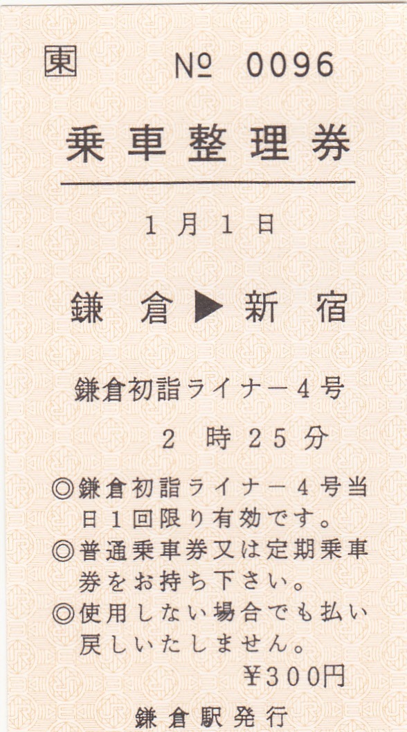 【JR東日本】鎌倉駅発行 鎌倉初詣ライナー4号 乗車整理券