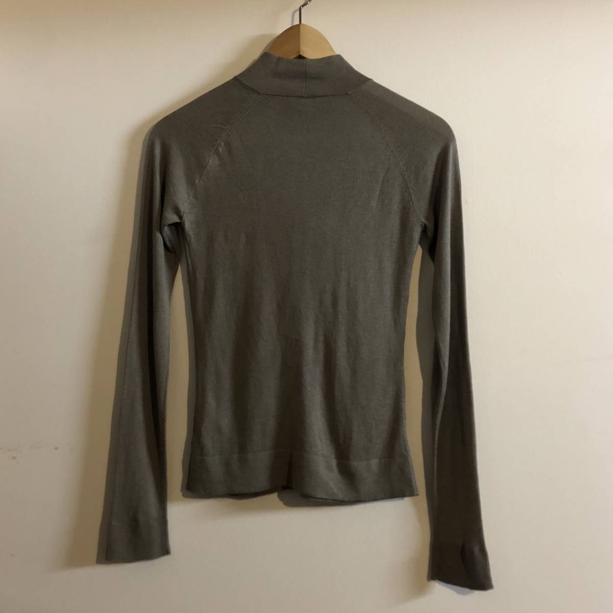 カラーはグレーカーキ系、素材はシルク60%・ビスコース26%・ウール12%・エラスタン2%になります。