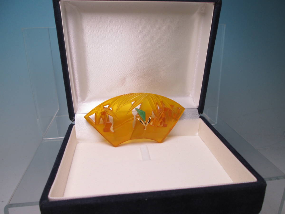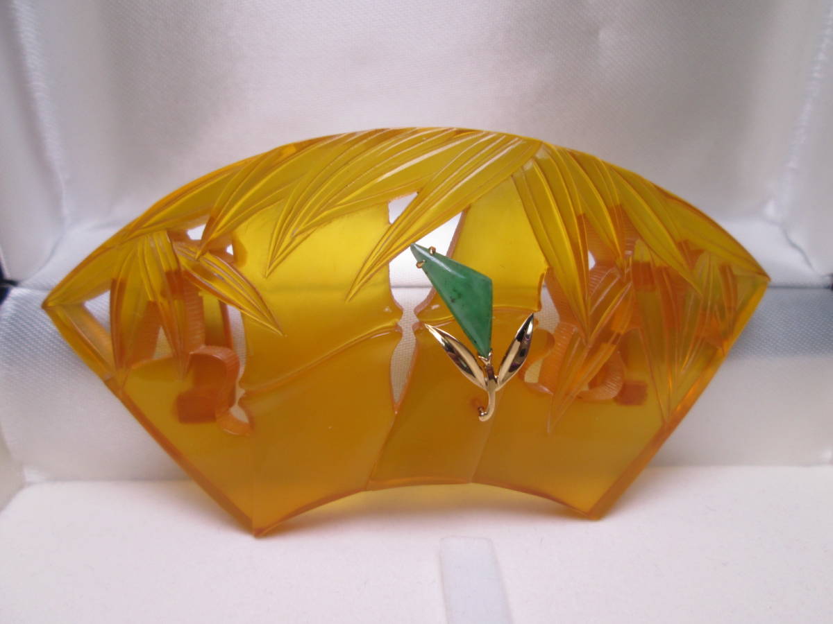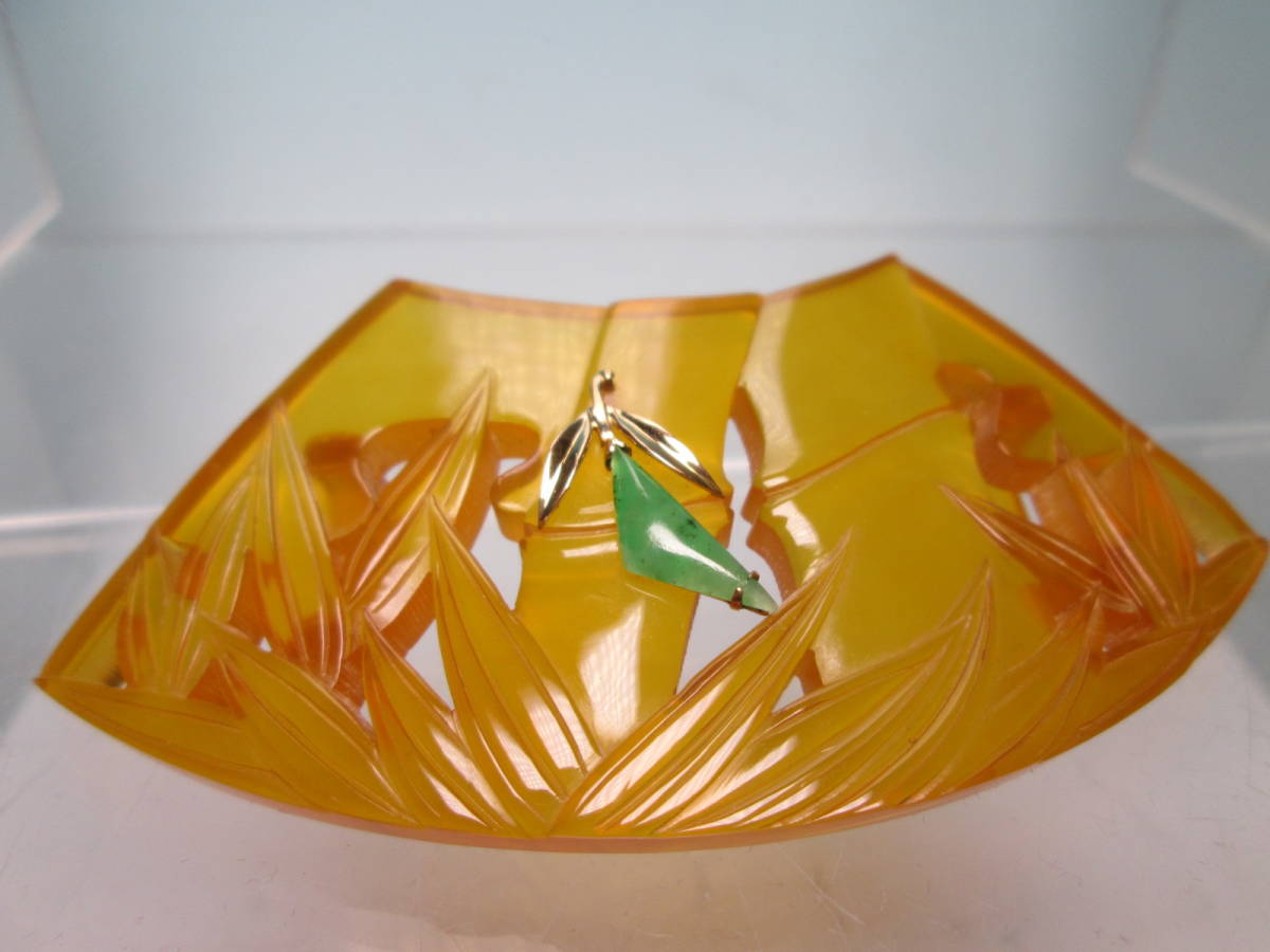 【江月】K18 大振り 8,35cm 本鼈甲 翡翠飾り 笹竹透かし文扇面の帯留め 12,68g 共ケース付